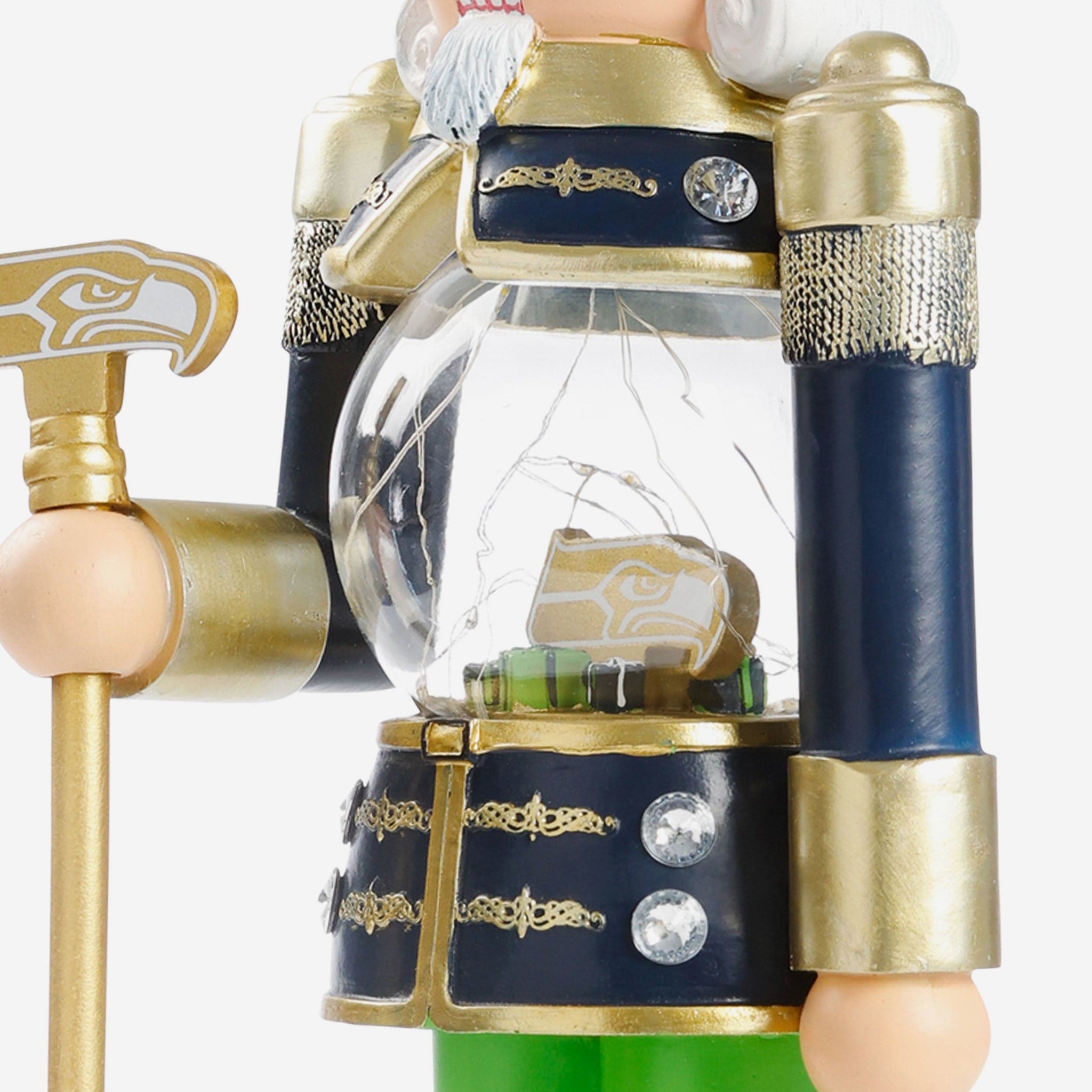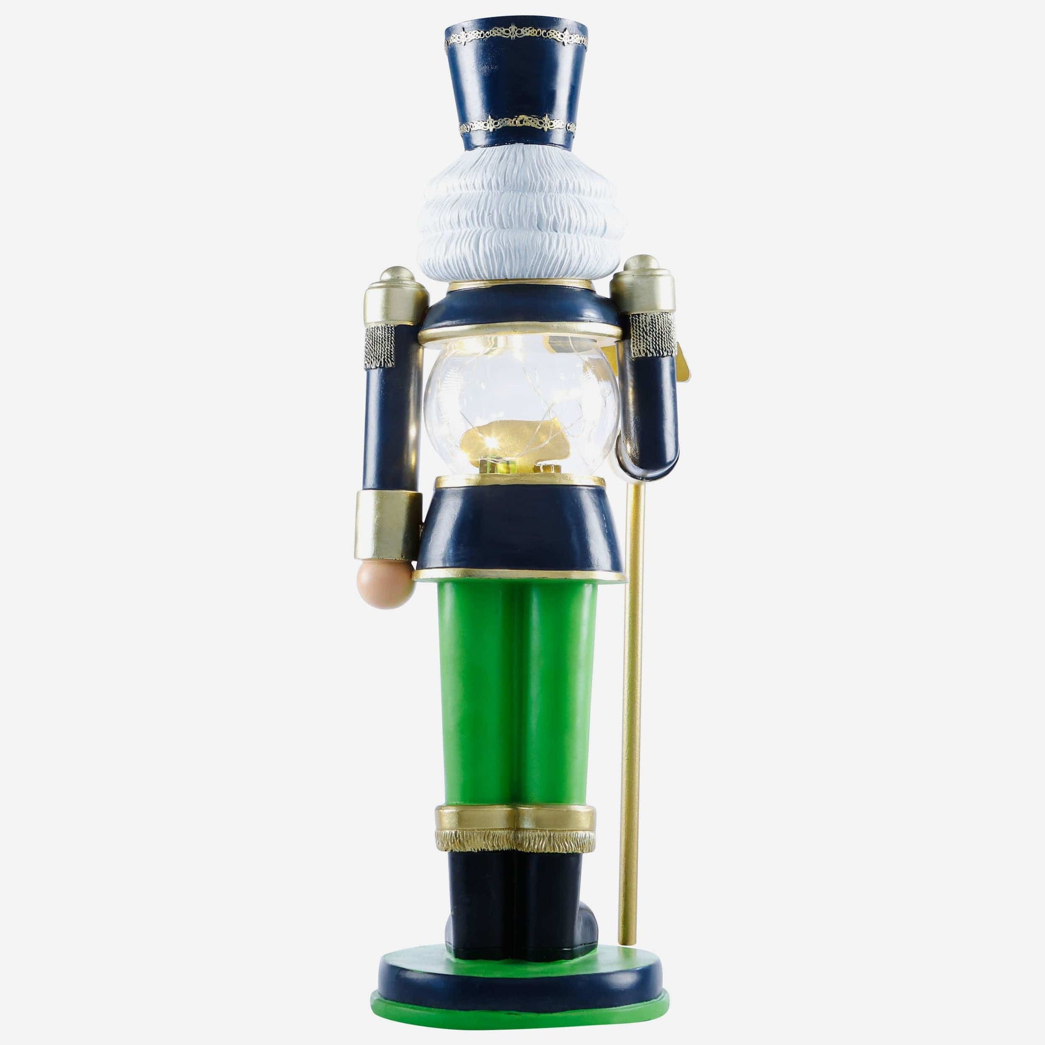 - Nutcracker's torso features clear globe with gold-colored team logo display, holiday gift accents, and light-up fairy lights for maximum holiday magic