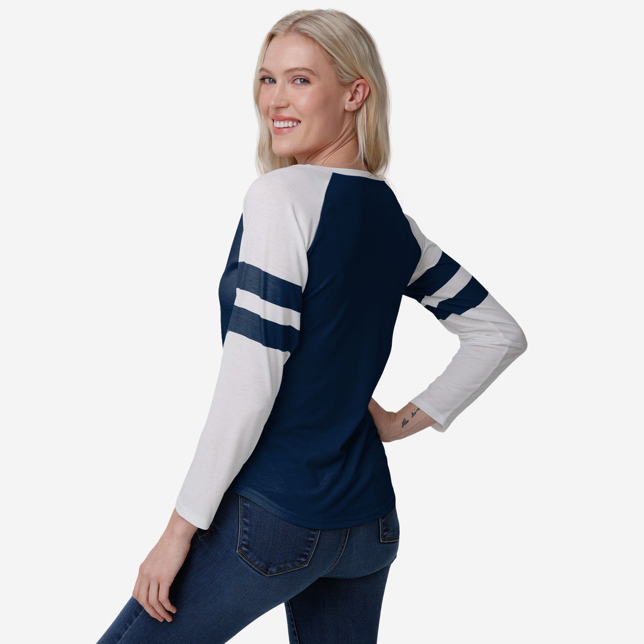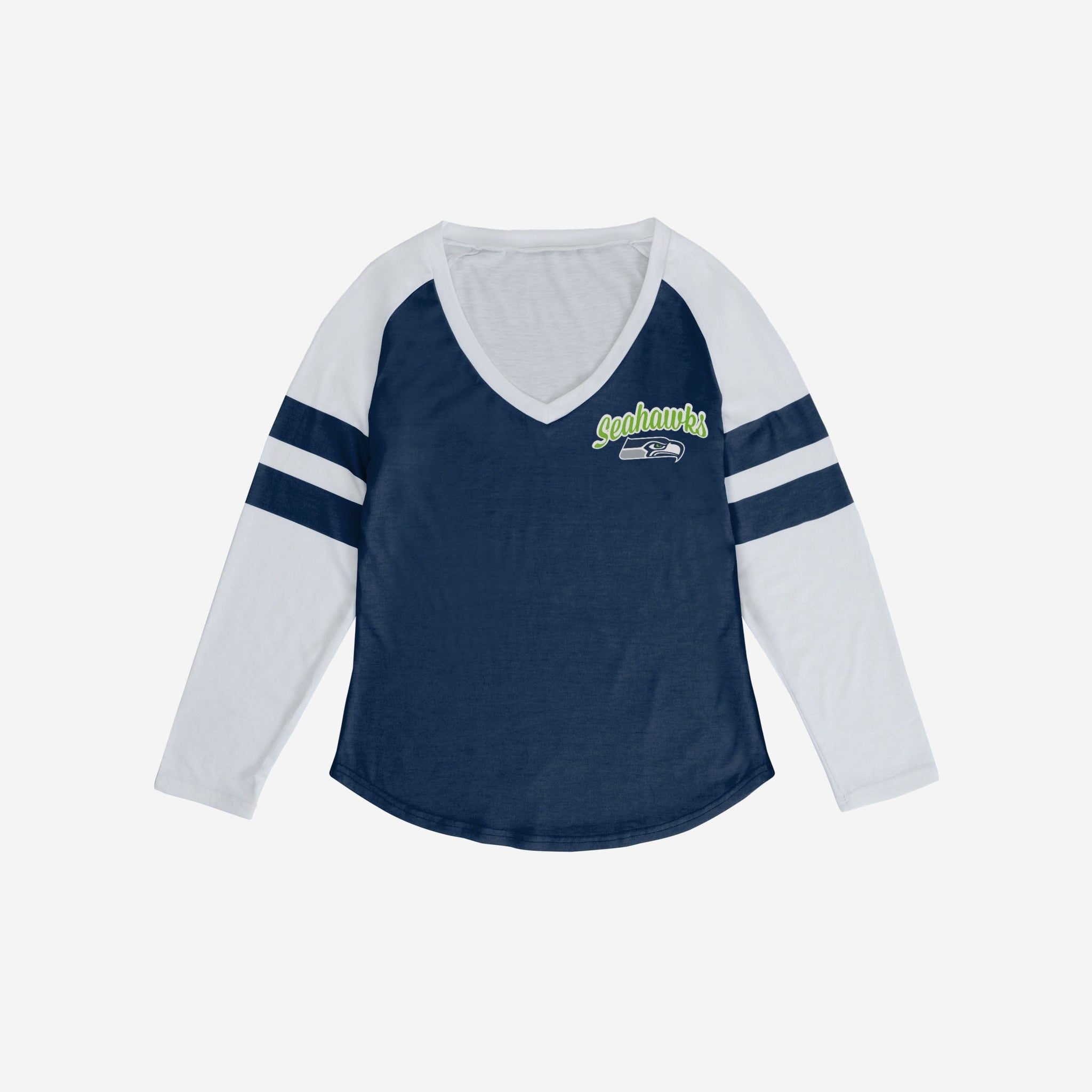 You couldn't script this fan fit better. Show off your fandom AND your fashion sense with this Seattle Seahawks Women's Script Wordmark Striped Sleeve Raglan T-Shirt.