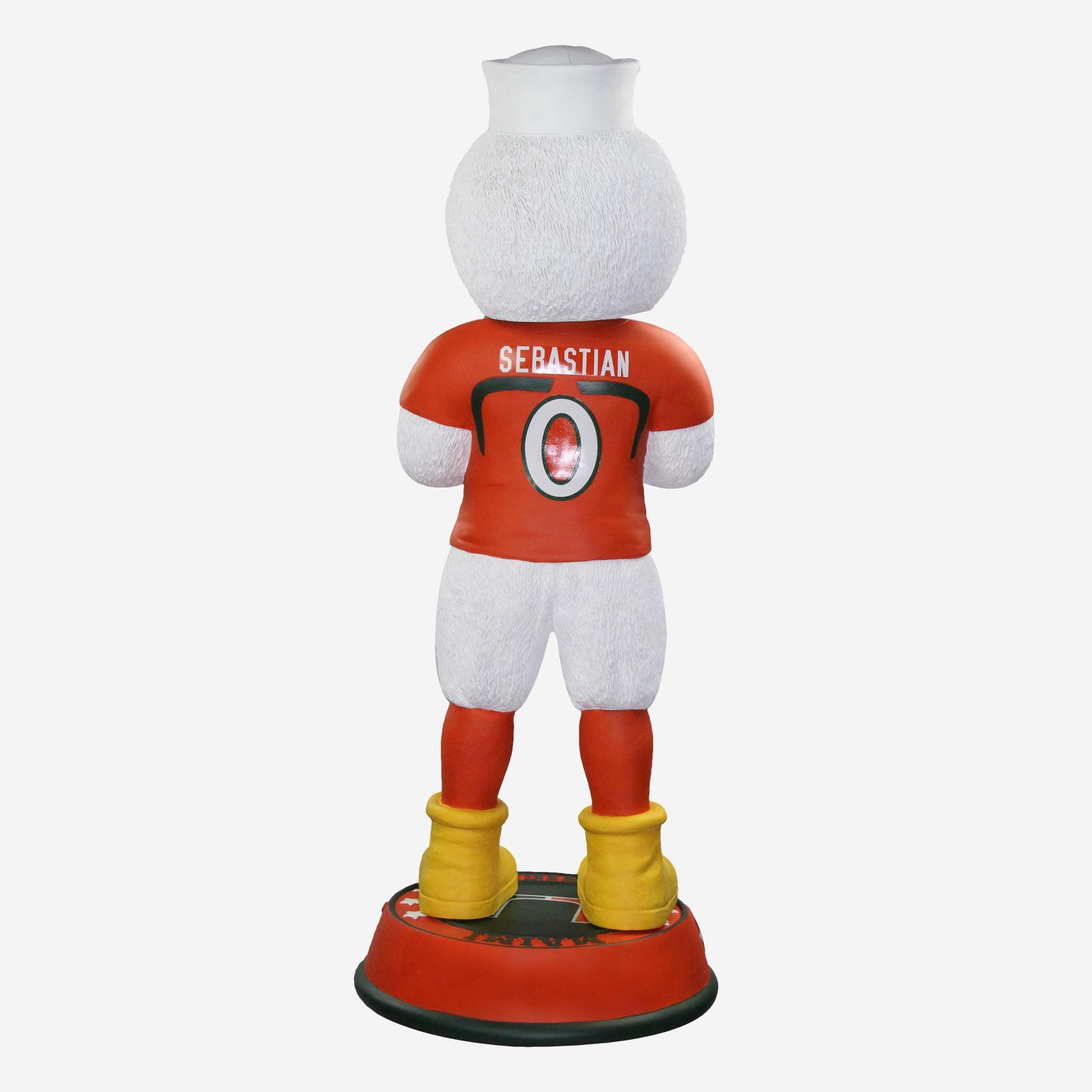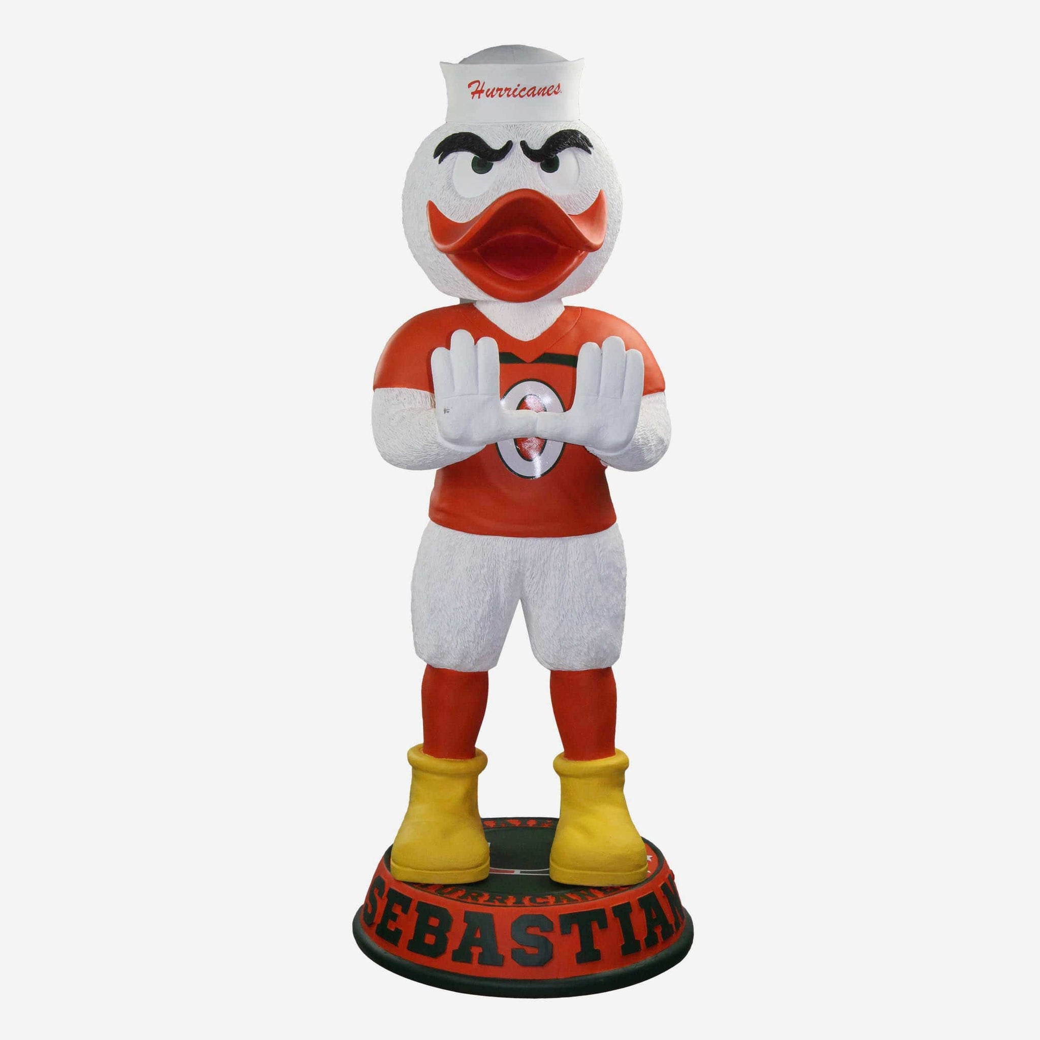 Go big or go home! Prove you're the biggest fan around by showing off the biggest bobblehead around - The Sebastian the Ibis Miami Hurricanes Orange Jersey 3 Ft. Mascot Bobblehead!