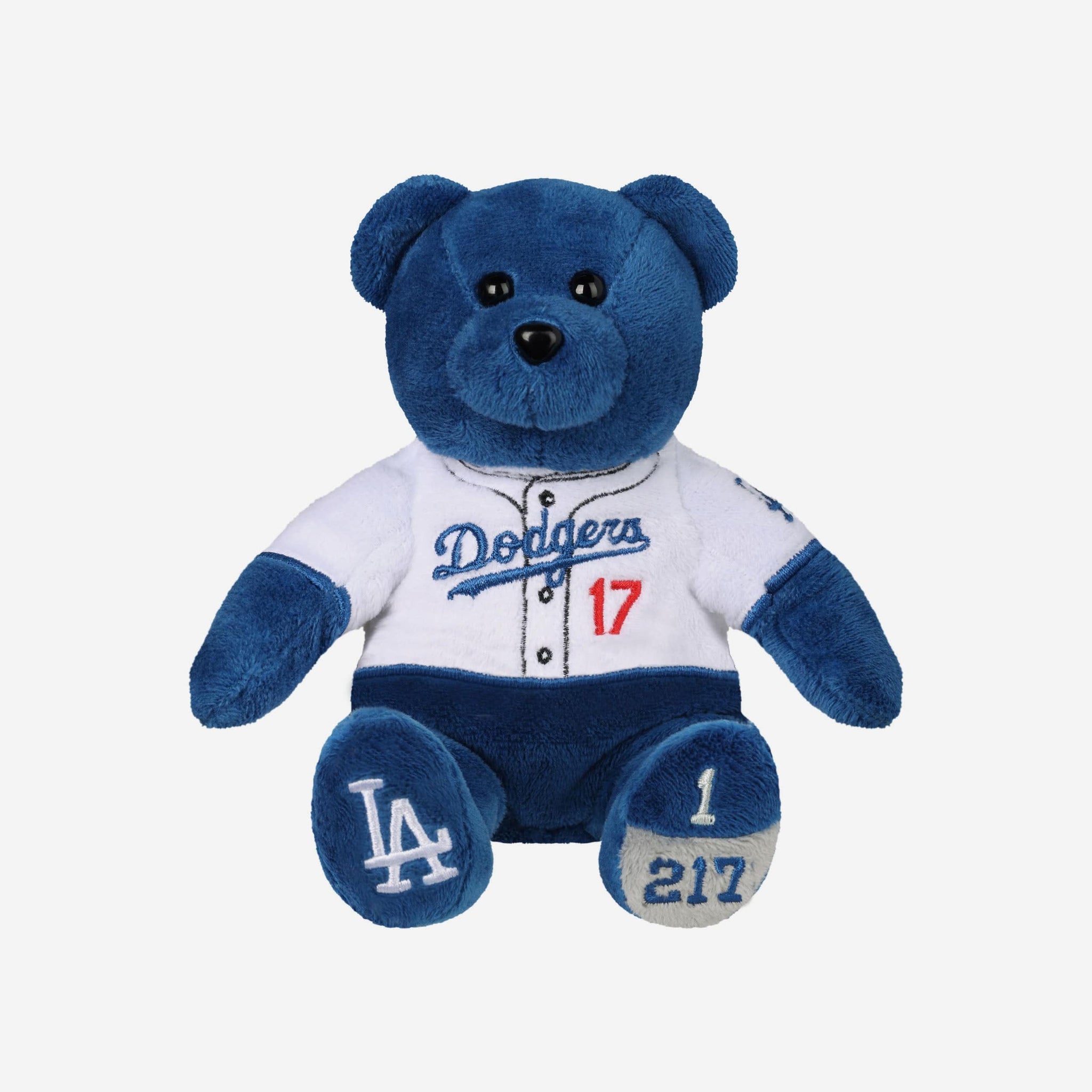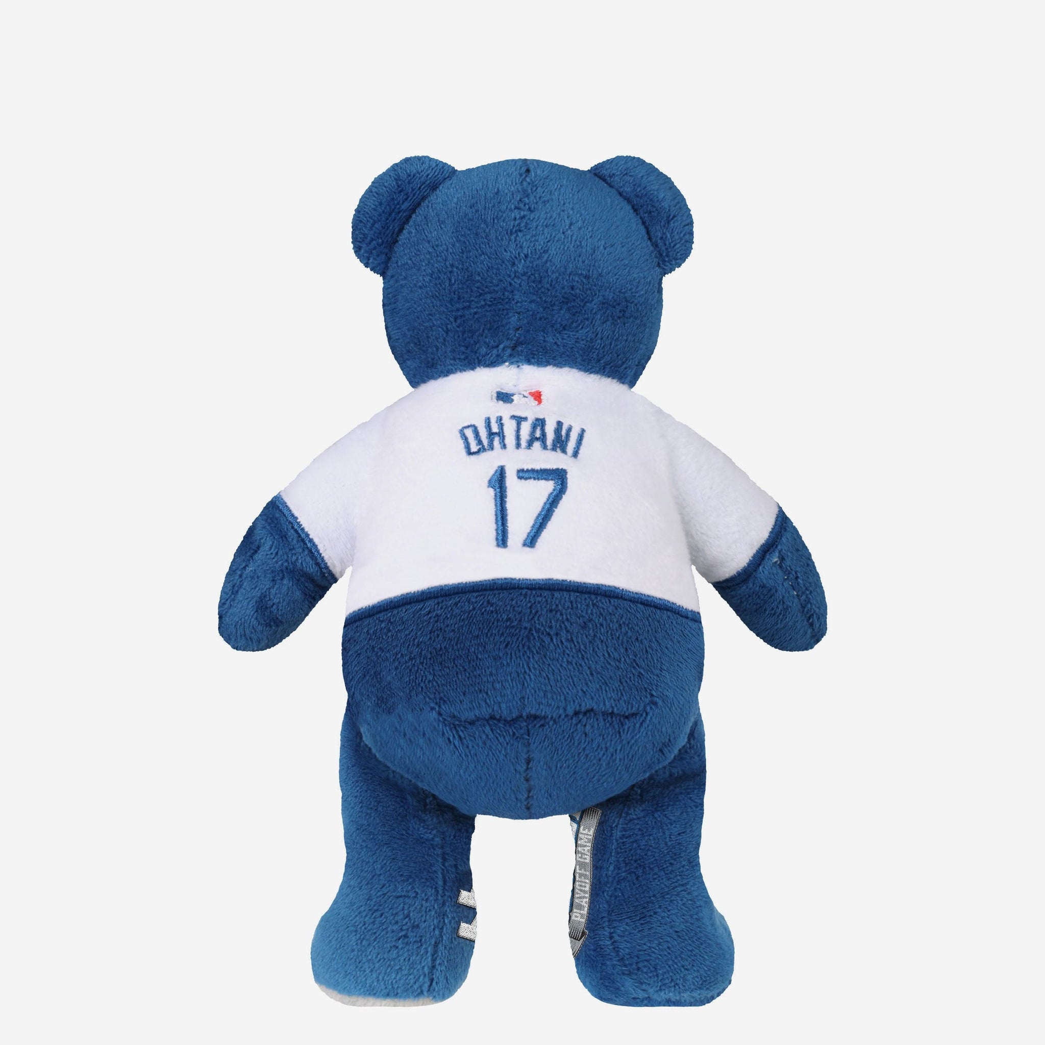 - Blue plush bear portrayed wearing Shohei Ohtani’s white gameday uniform that will look great in your MLB collection