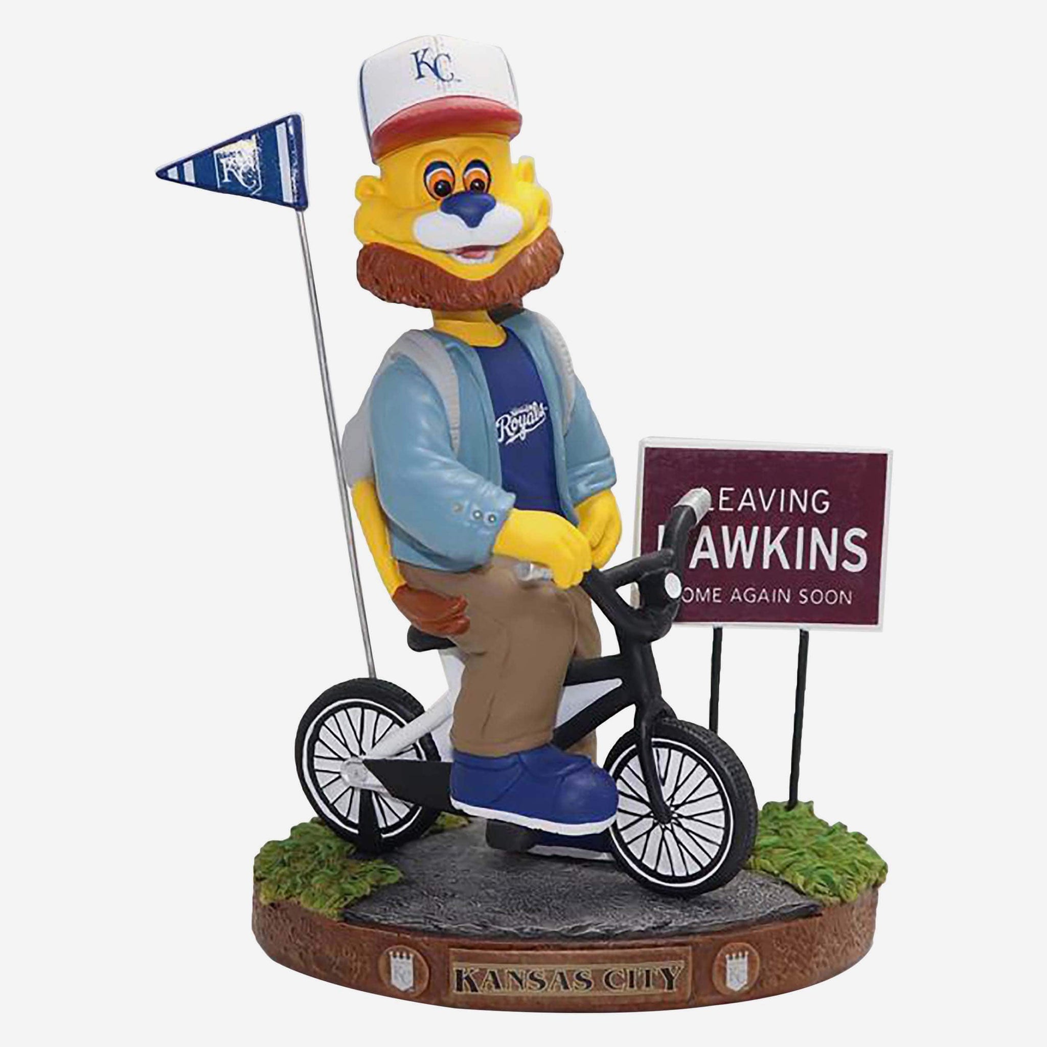 Welcome to Hawkins, Indiana. Home of the Stranger Things kids, and now, your favorite mascot. Get on your bicycle and join this Sluggerrr Kansas City Royals Stranger Things Mascot on Bike Bobblehead for an adventure. Just make sure you're home by dinner.