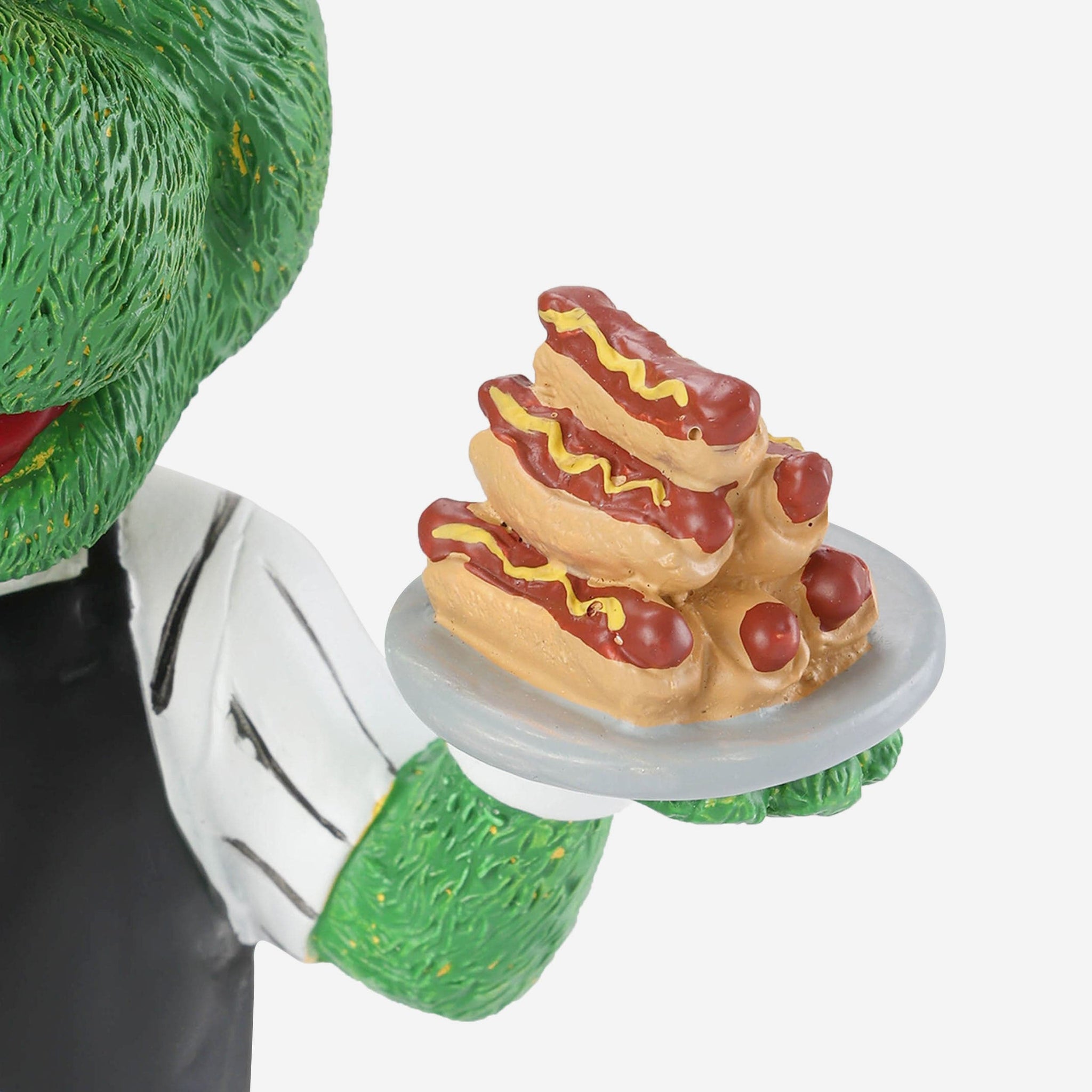 • Portrays mascot posing in a team-colored apron while holding a spatula and a plate of hot dogs, so we hope you're hungry