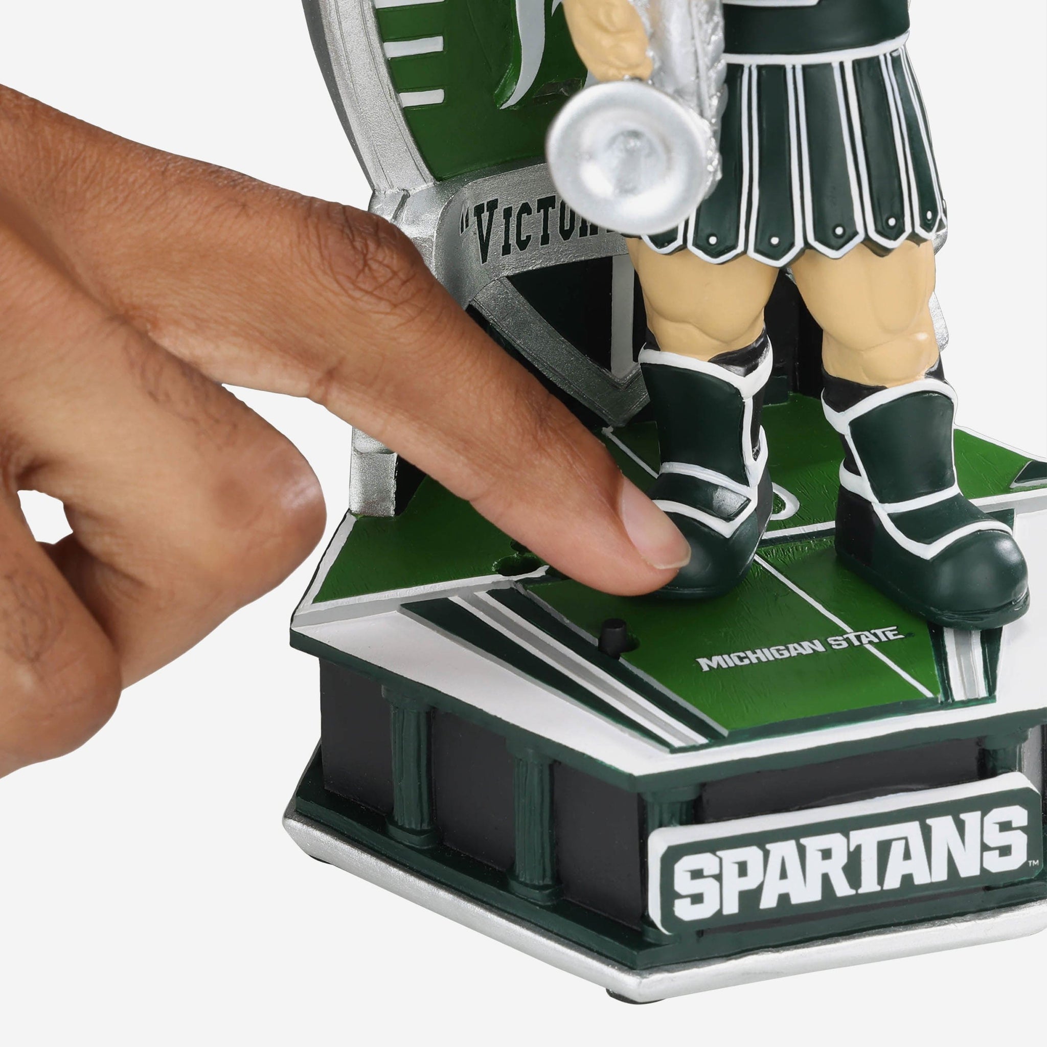 Clear your throat, warm up those vocal cords, and get ready to belt out every Spartan's favorite tune. With the push of a button, this Sparty Michigan State Spartans Fight Song Mascot Bobblehead plays the iconic "Victory for MSU." Fight Song officially licensed by 2Thumbz, Inc.
