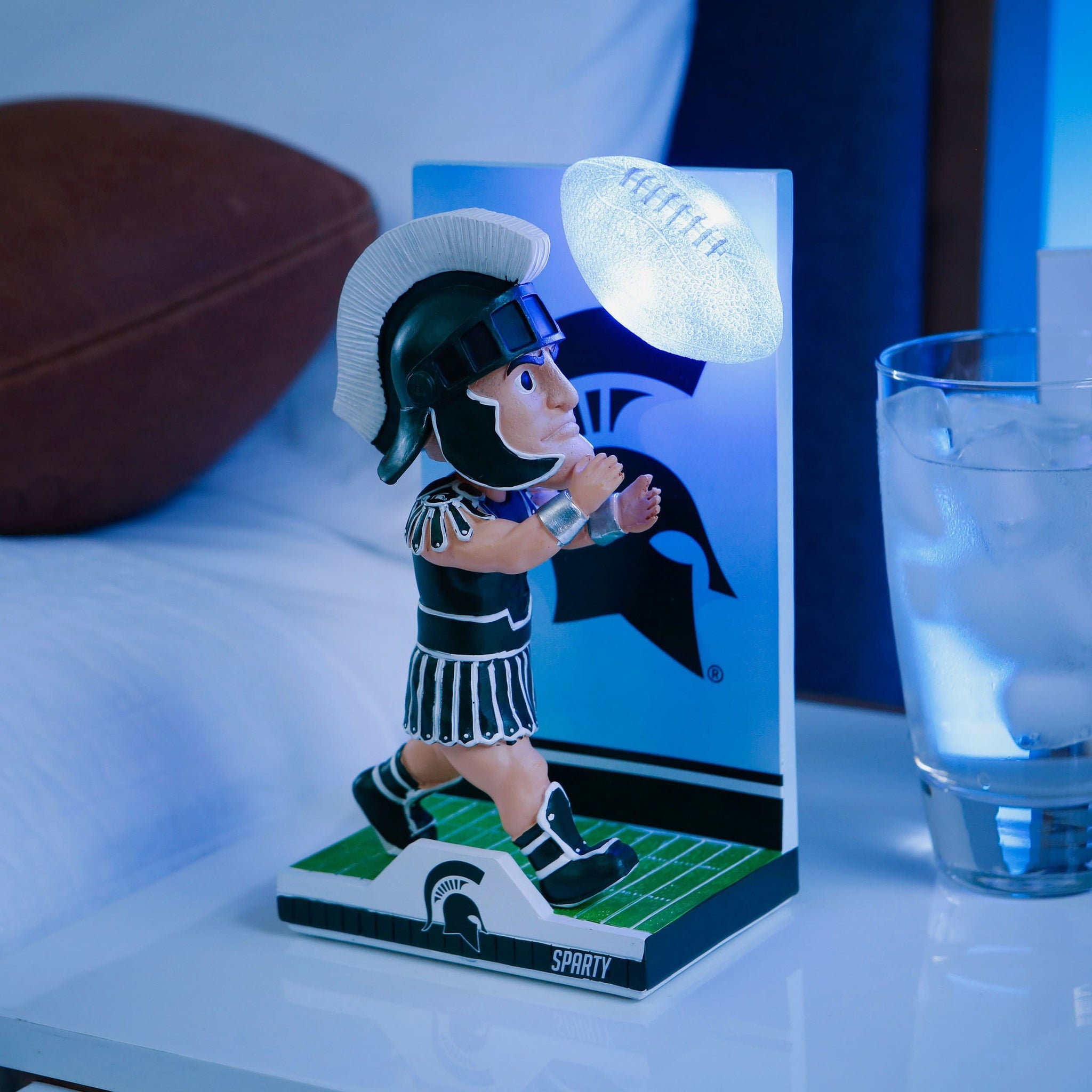 A bobblehead so bright, you're gonna need shades! Make sure your team pride shines like a beacon of awesome by showing off this Sparty Michigan State Spartans Mascot Action Pose Light Up Ball Bobblehead in your fancave!