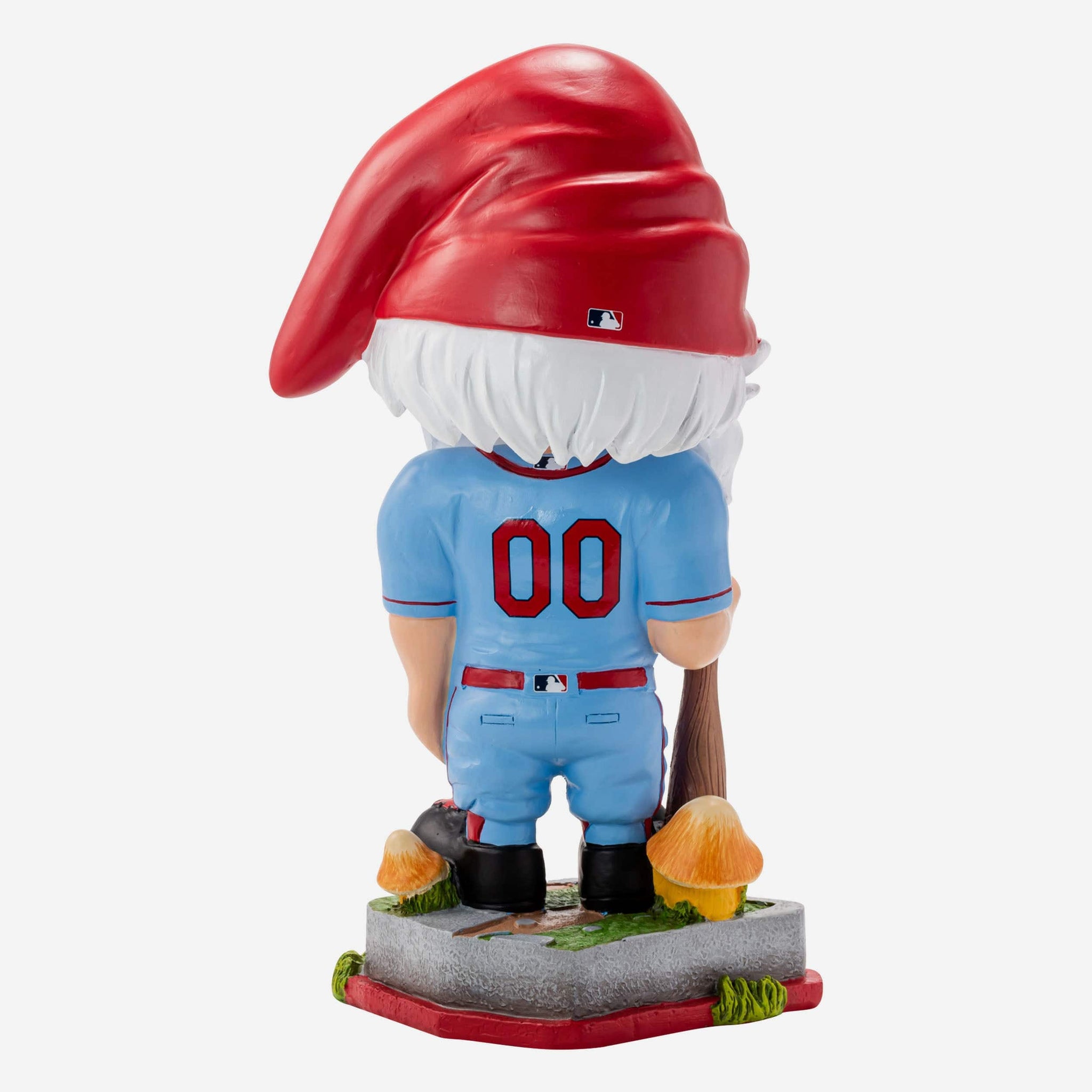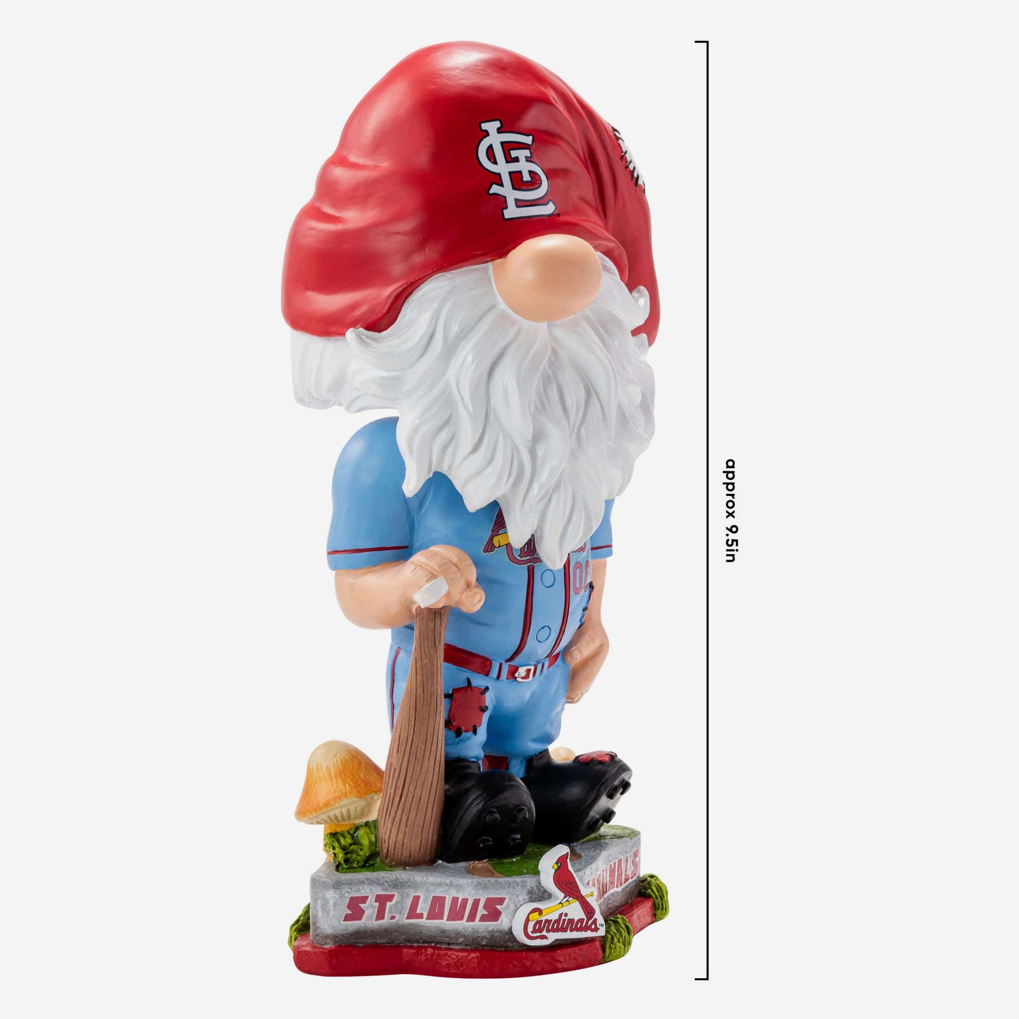 - Portrays gnome posing in his blue gameday uniform and holding a baseball bat, ready to swing for the fences