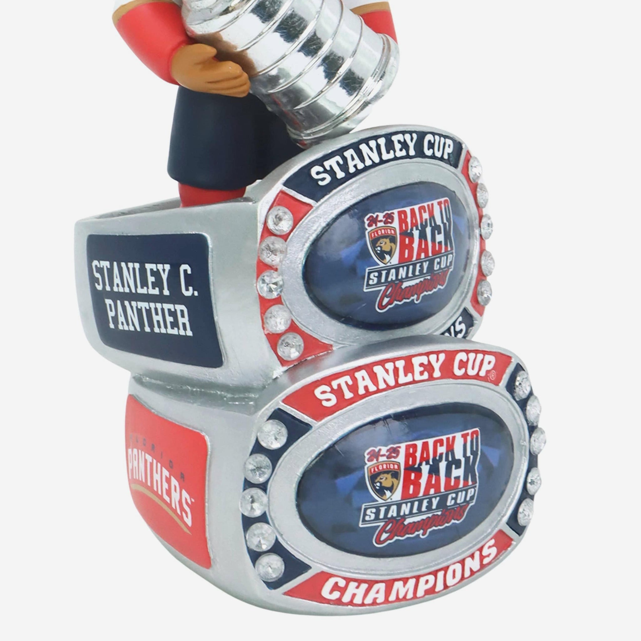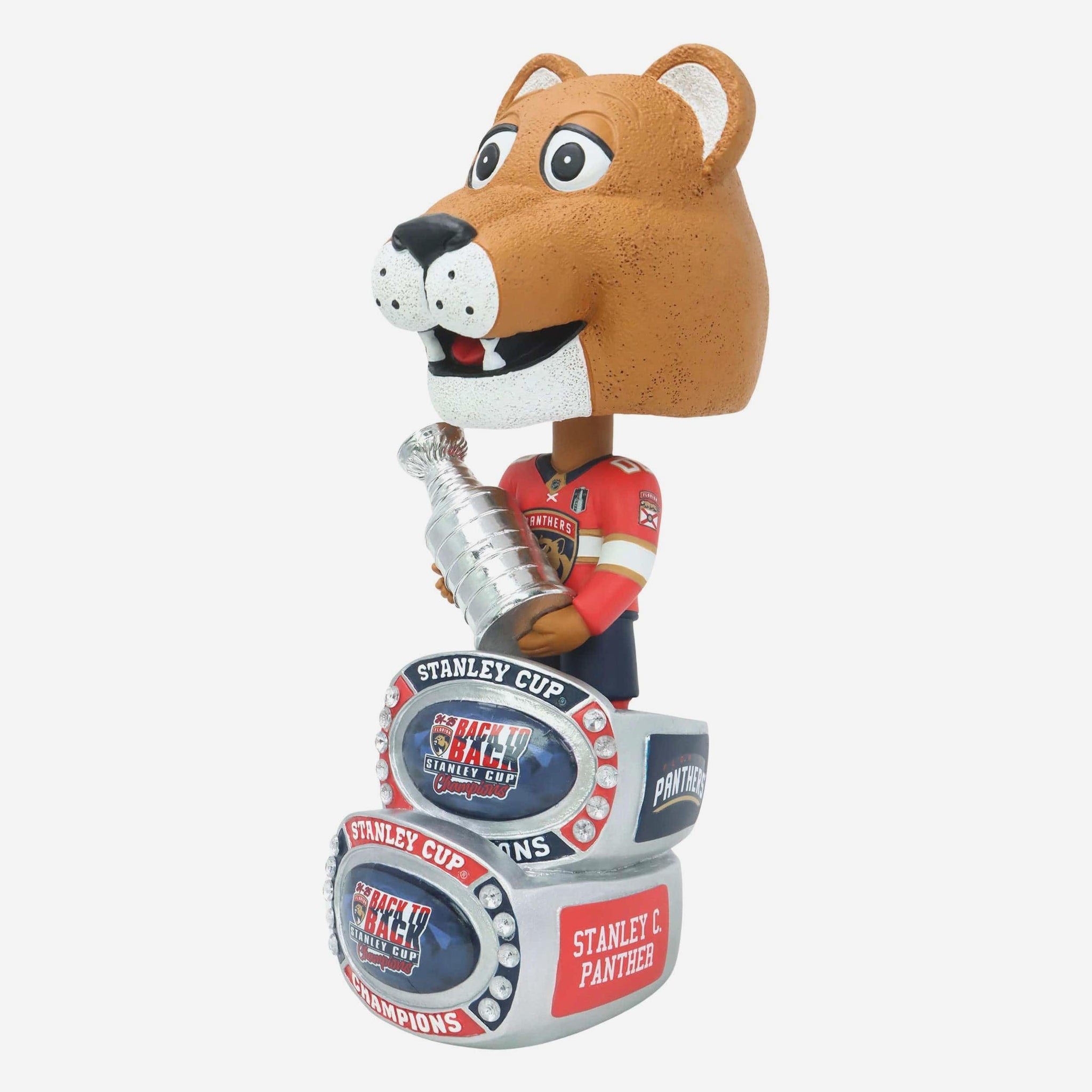 Add some championship bling to your bobble collection! Get the party started in your collection with the Stanley C Panther Florida Panthers 2025 Back To Back Stanley Cup Champions Ring Base Mascot Bighead Bobblehead.