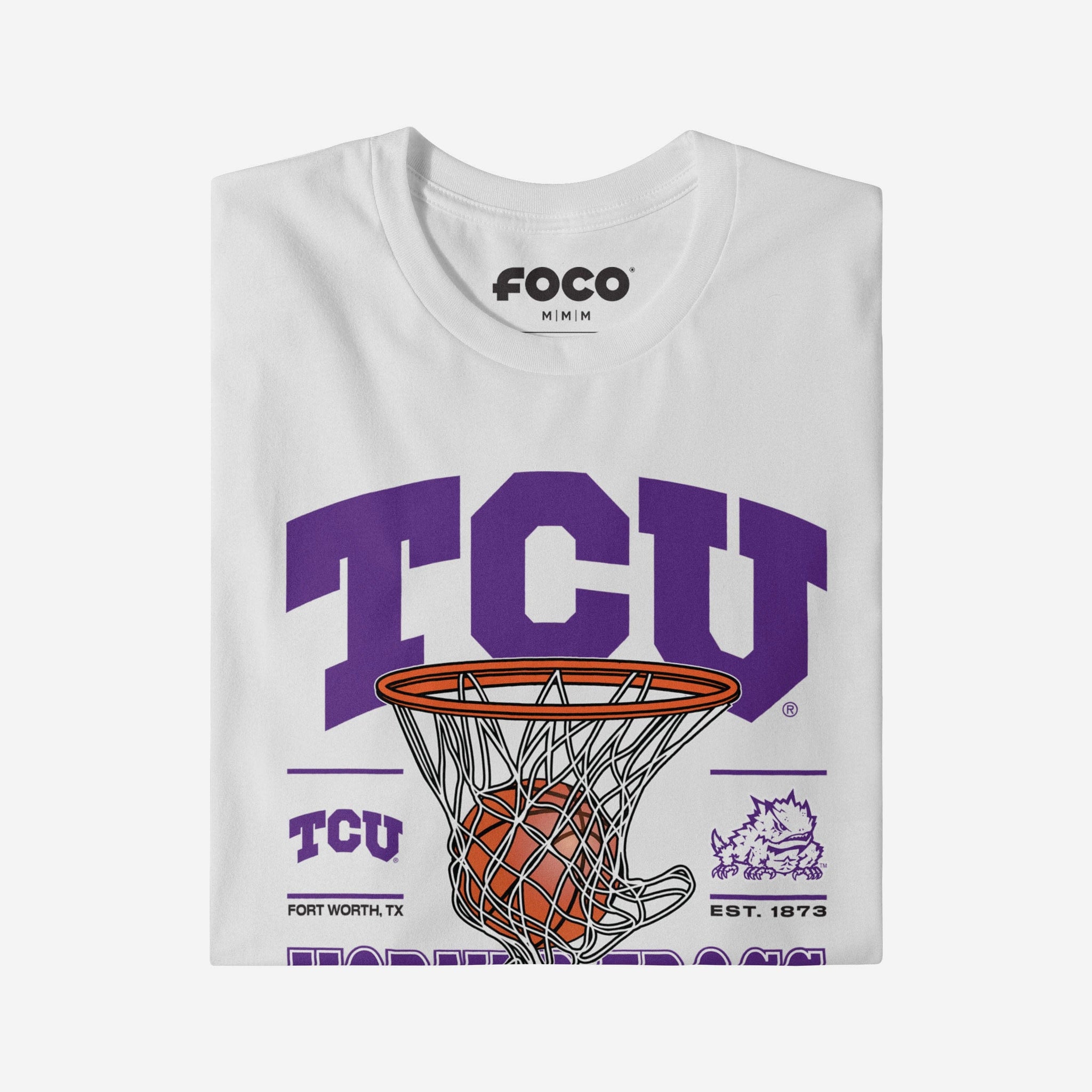 This top features a design that showcases your all-important team colors, a team logo display, a team wordmark name display, year of team establishment, and a basketball swishing through a net display meaning this t-shirt will prove your unmatched dedication to the TCU Horned Frogs when youĺre at the game or watching at home. In other words, this graphic tee is about to be your new favorite teammate.