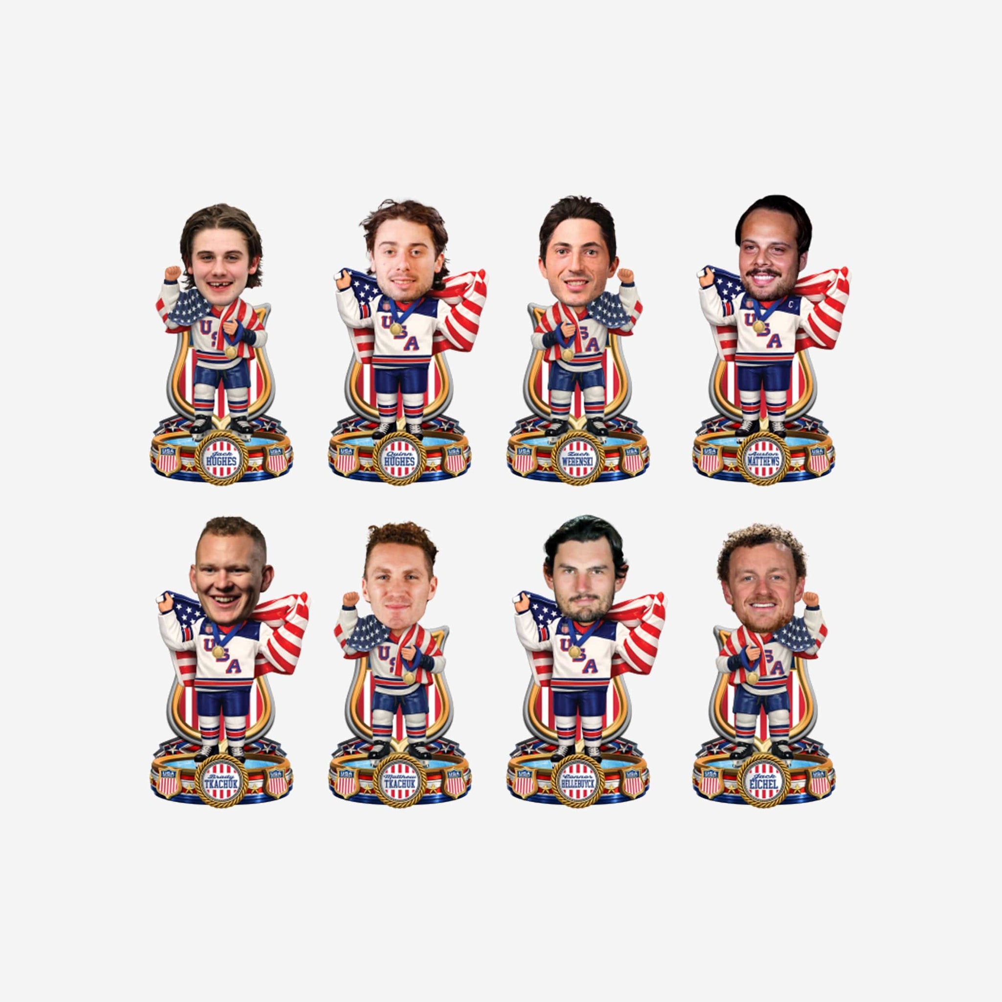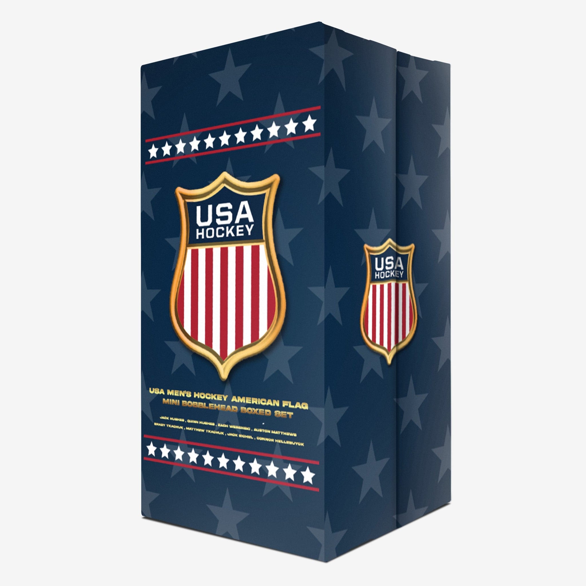 Stars, stripes, and superstar talent! Celebrate Team USA pride with this USA Men's Hockey American Flag Mini Bobblehead Boxed Set. Featuring Jack Hughes, Zach Werenski, Connor Hellebuyck, Quinn Hughes, Brady Tkachuk, Matthew Tkachuk, Jack Eichel, and Auston Matthews, this all-star lineup showcases eight of USA Hockey’s brightest stars standing proudly with the American flag. With patriotic designs and incredible player likenesses, this collectible set is the ultimate way for hockey fans to honor the red, white, and blue.