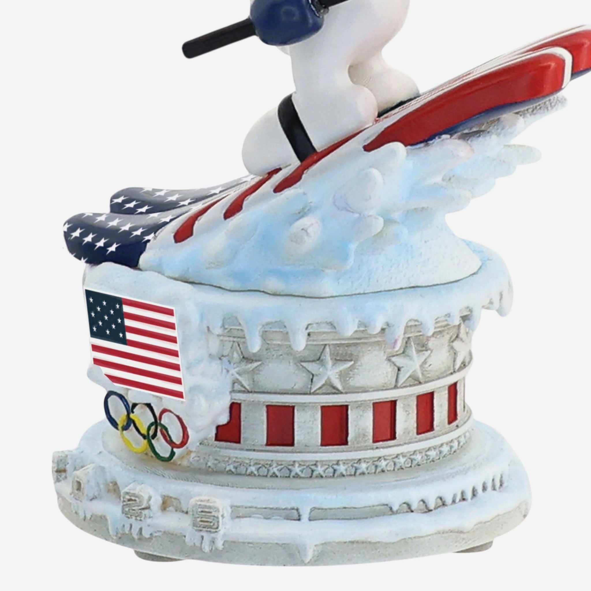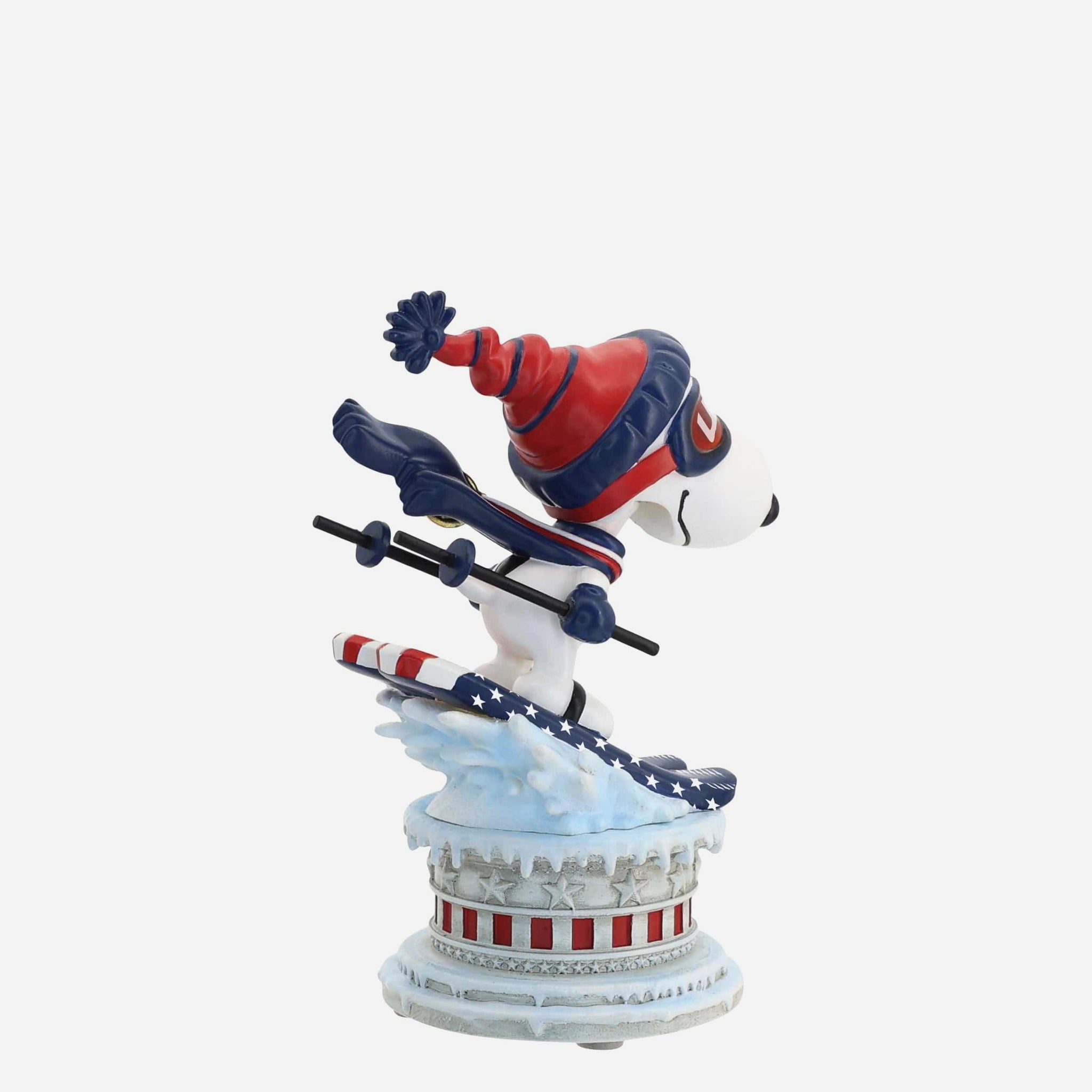 Soar into wintertime excitement with this Team USA Snoopy Peanuts Ski Jump Mini Bobblehead, capturing Snoopy mid-flight as he takes off in patriotic style.