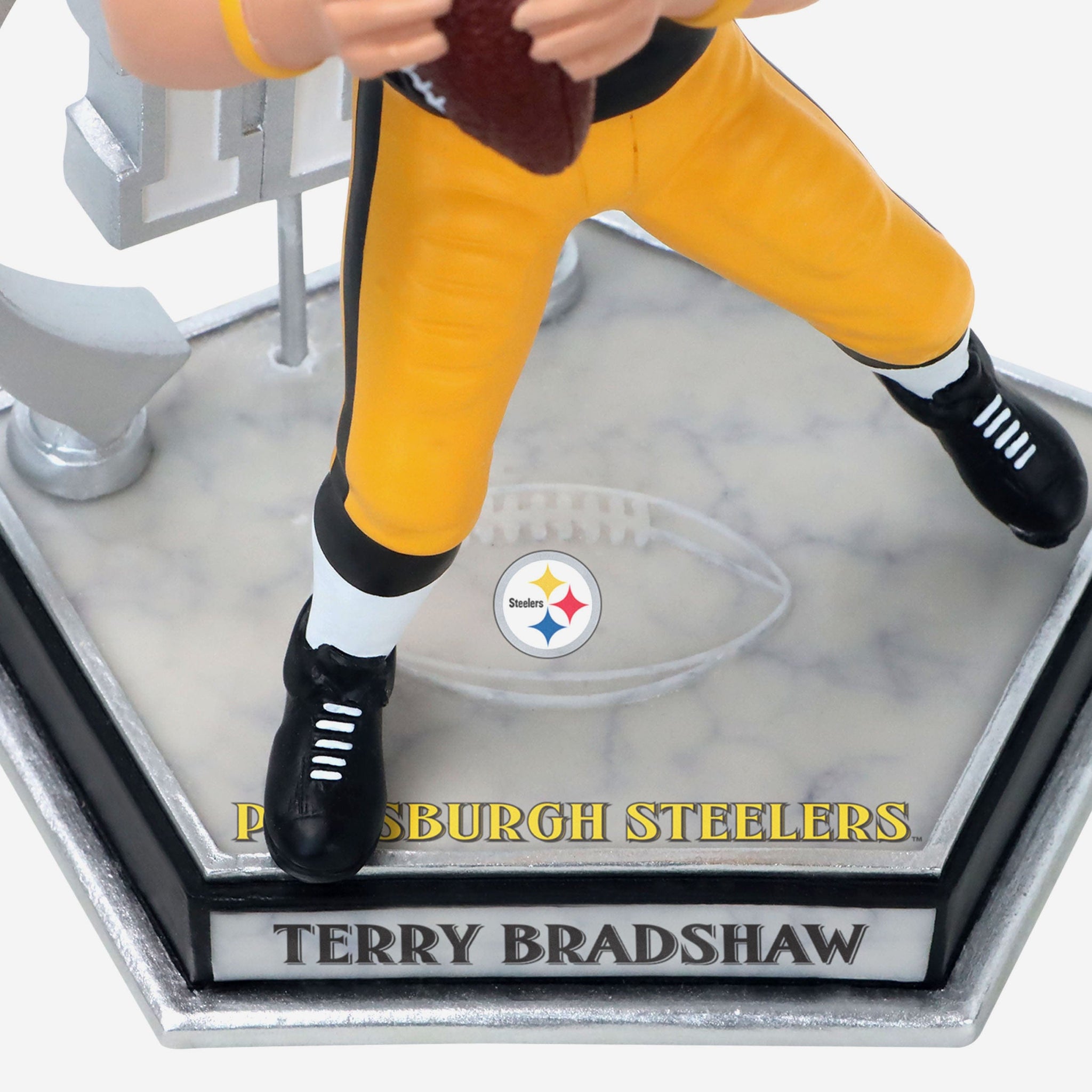 • Portrays Bradshaw posing and wearing his black gameday uniform, showing off his legendary skills