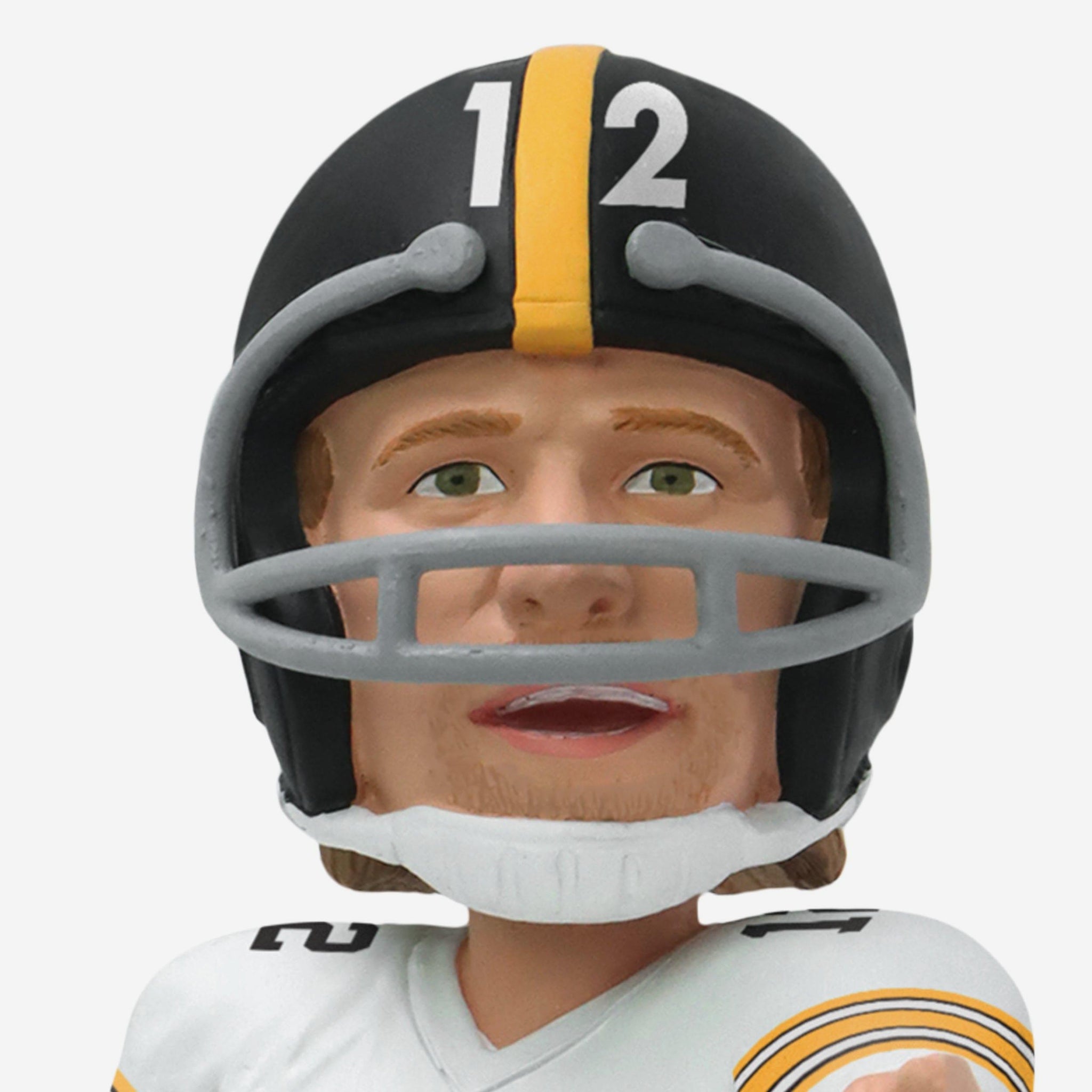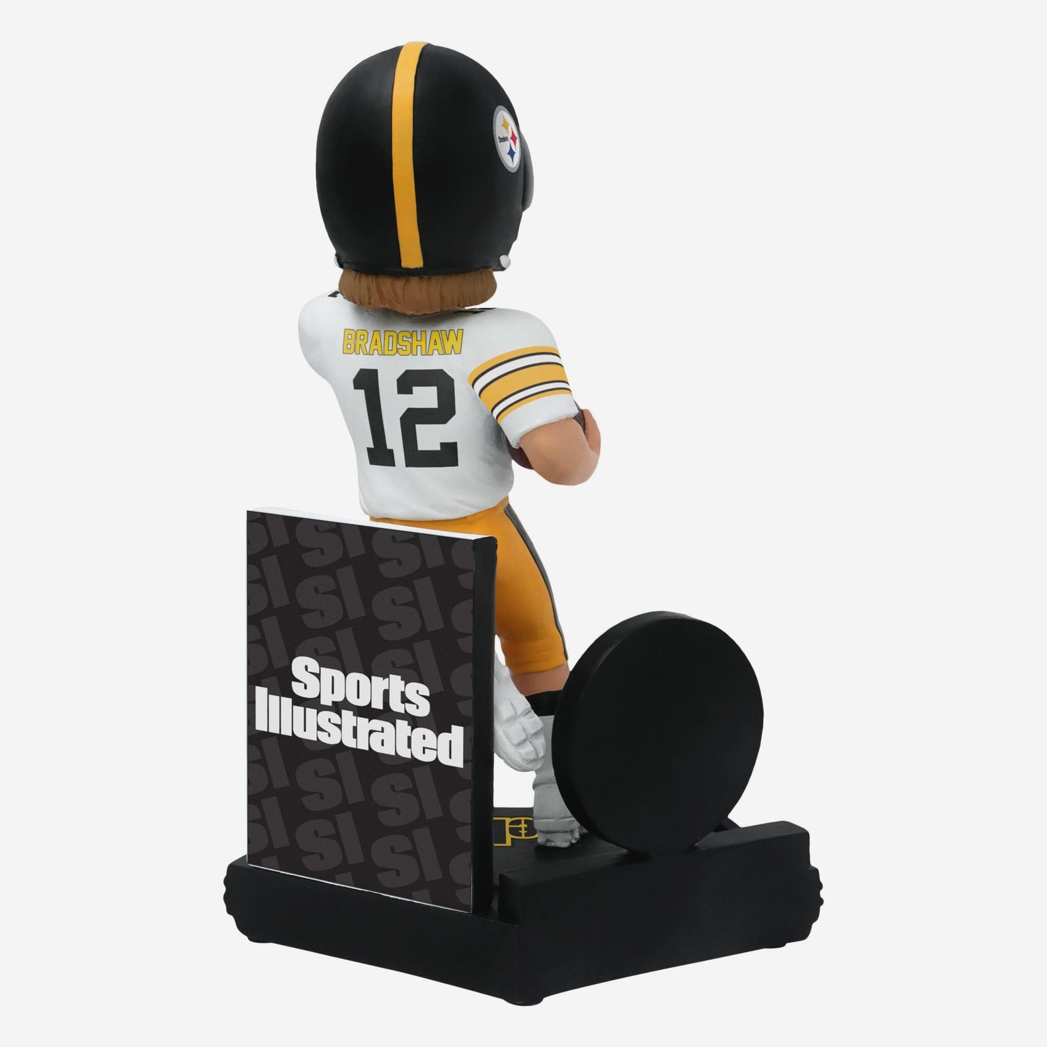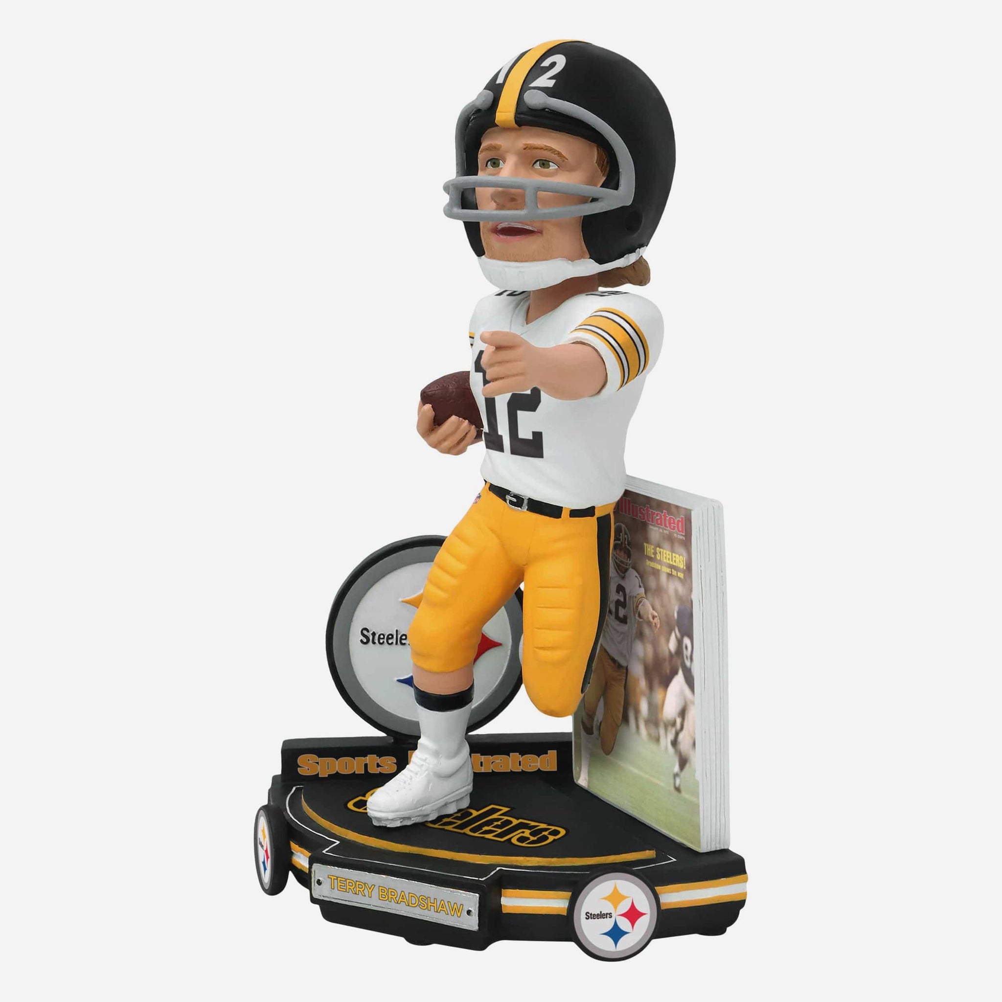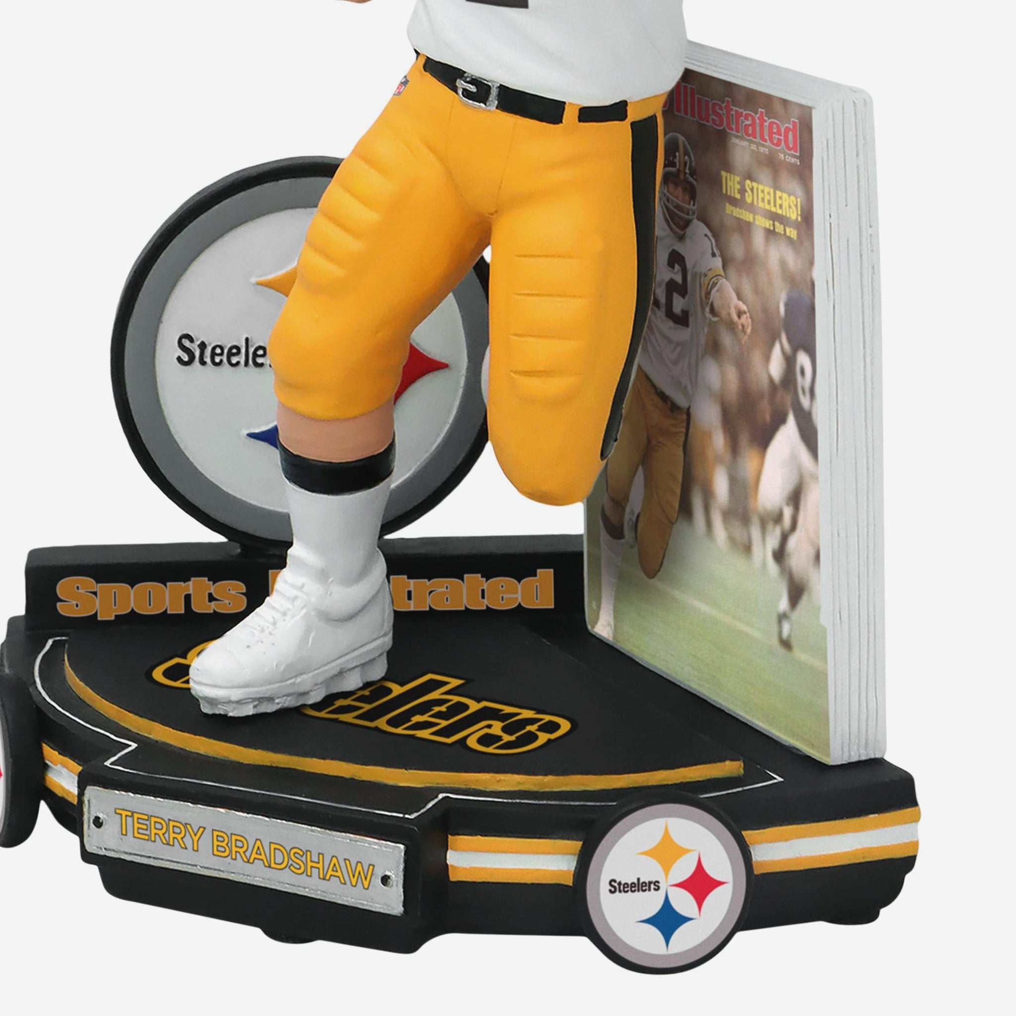 - Portrays Bradshaw wearing his white gameday uniform, re-creating his famous Sports Illustrated cover