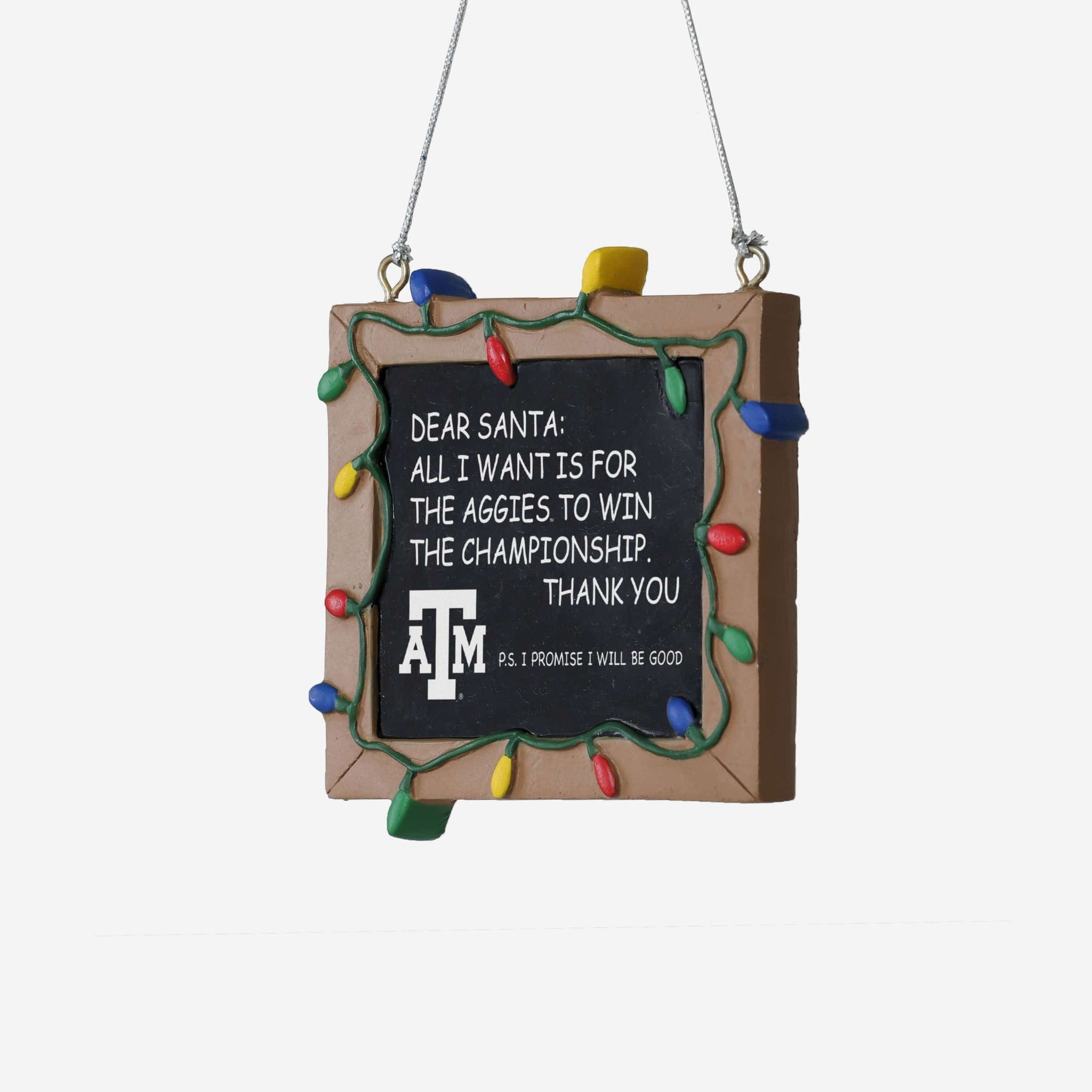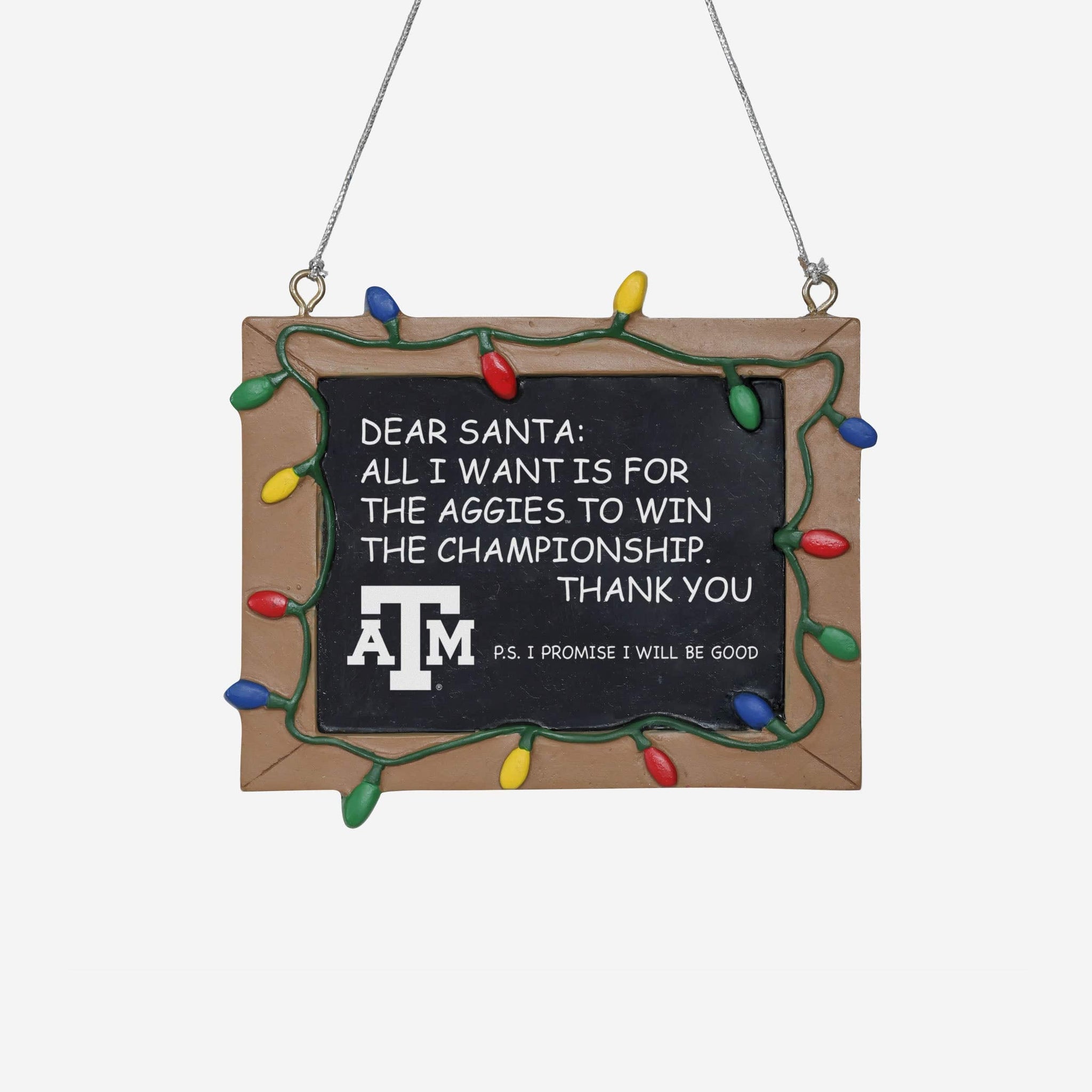 So, you made your list and sent it to jolly ol' Fanta Claus, asking him for a championship. But sometimes letters can get lost in the mail. Just in case, put this Texas A&M Aggies Resin Chalkboard Sign Ornament on your tree to let him know how good you've been this year, and that all you want for the holidays is a trophy.