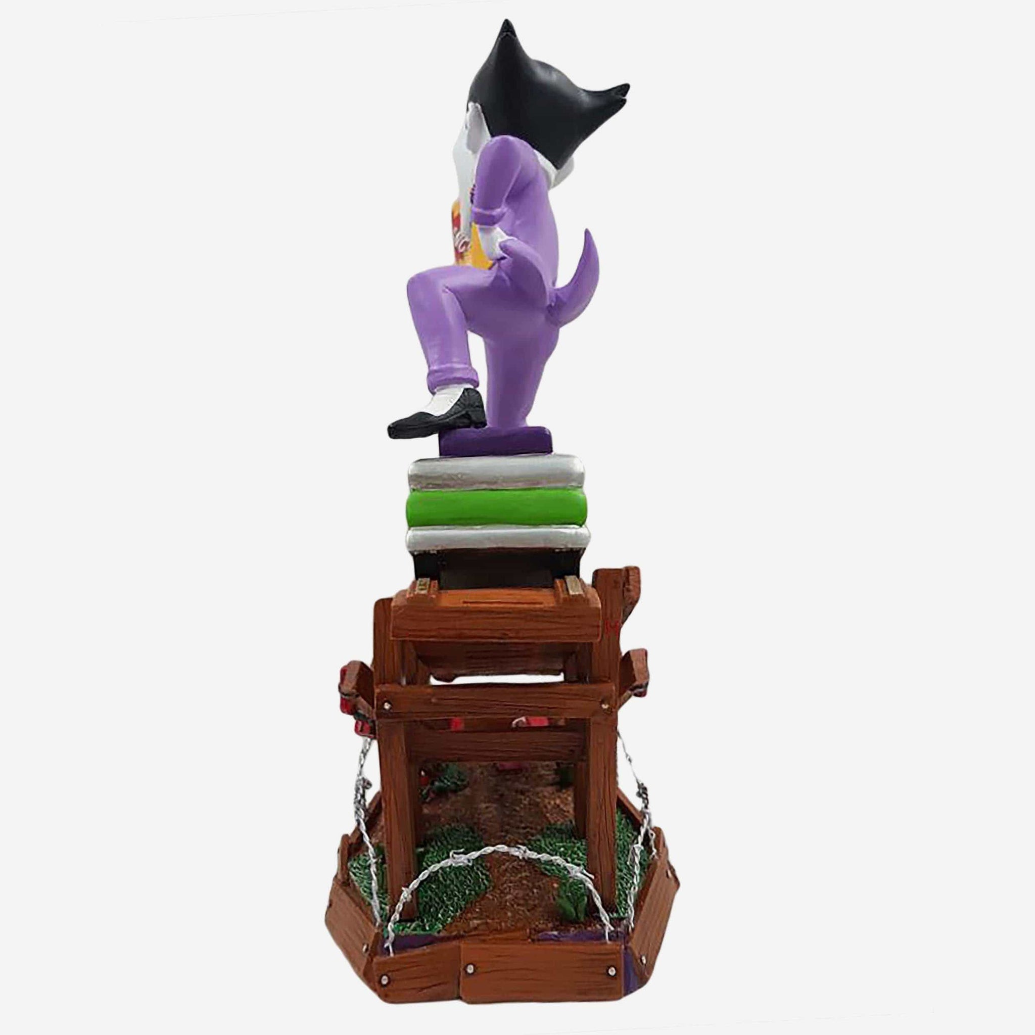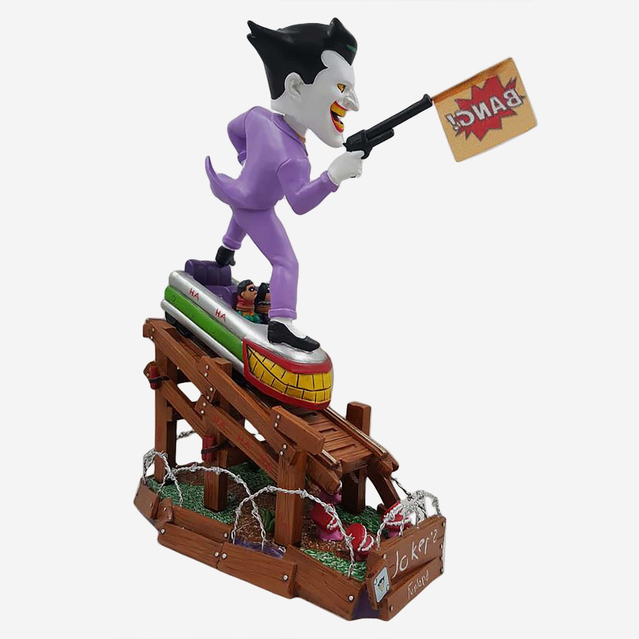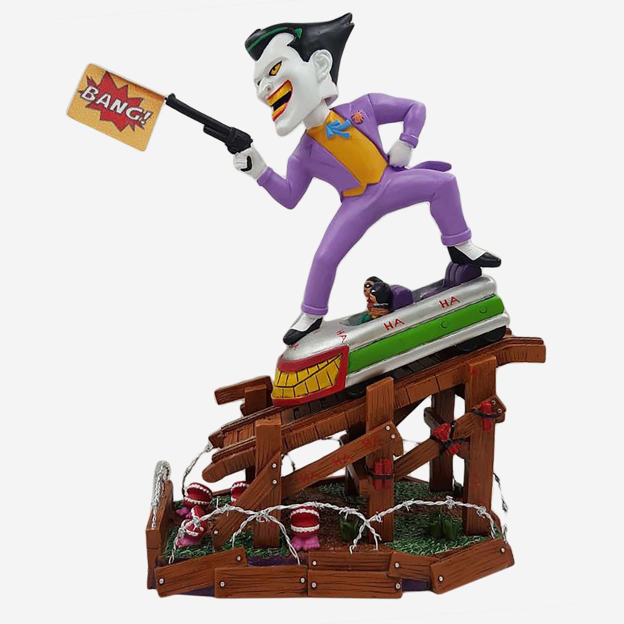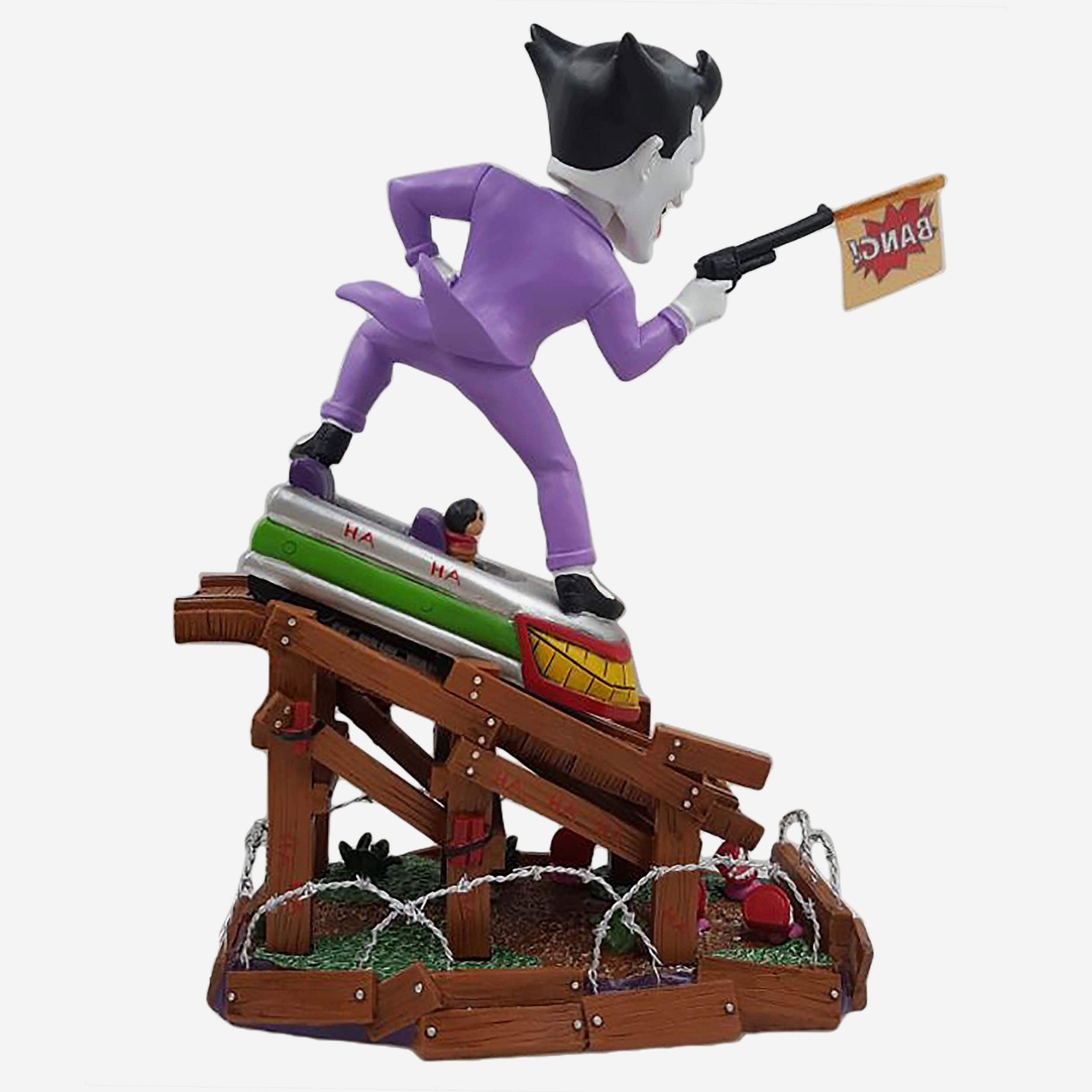 • Portrays Joker holding pistol and posing on top of roller coaster with miniature Batman and Robin toys, riding towards destruction