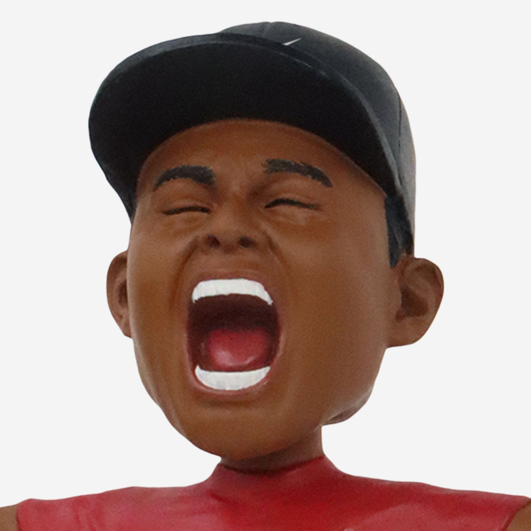 - Portrays Woods wearing a black cap, red shirt, and black pants, re-creating his famous Sports Illustrated cover