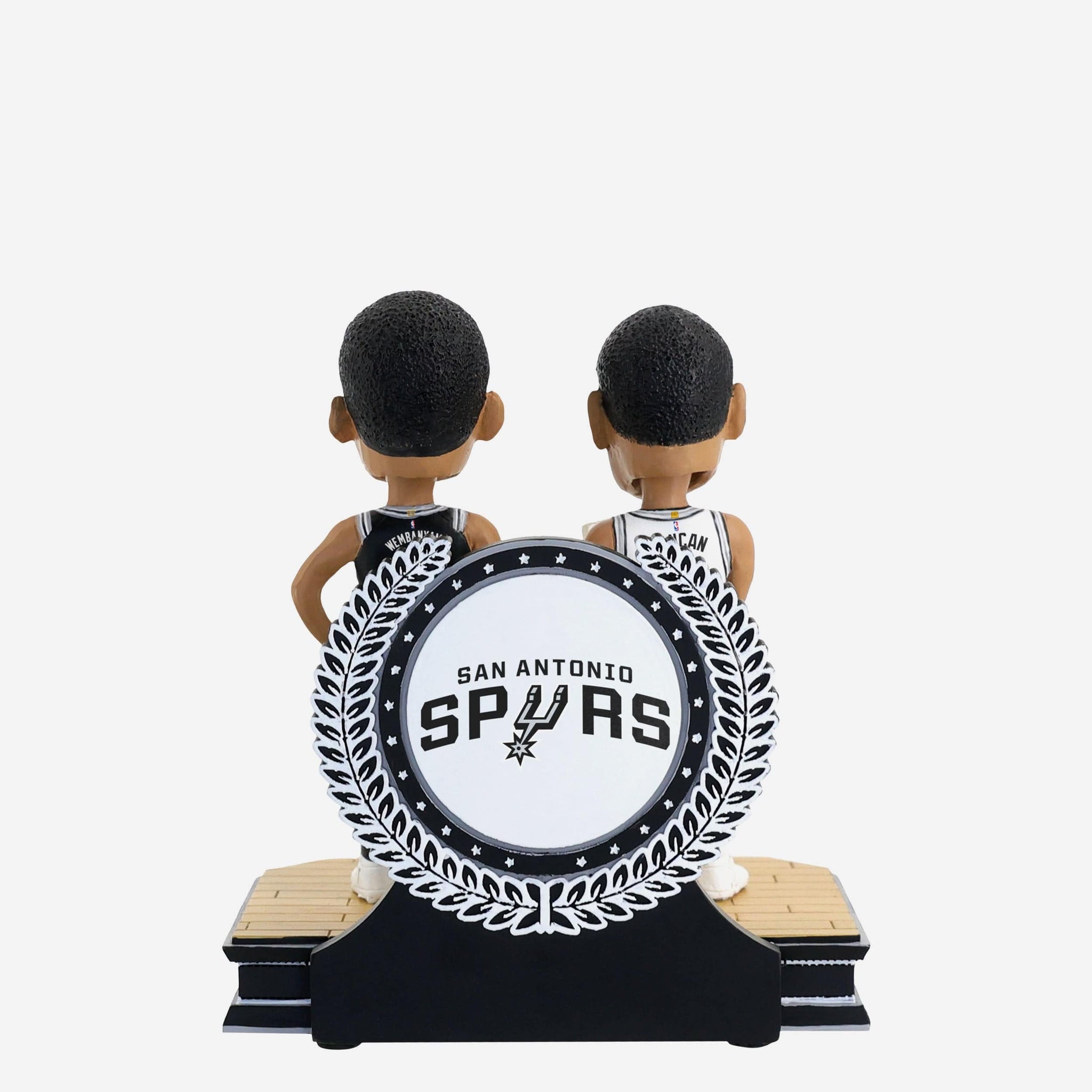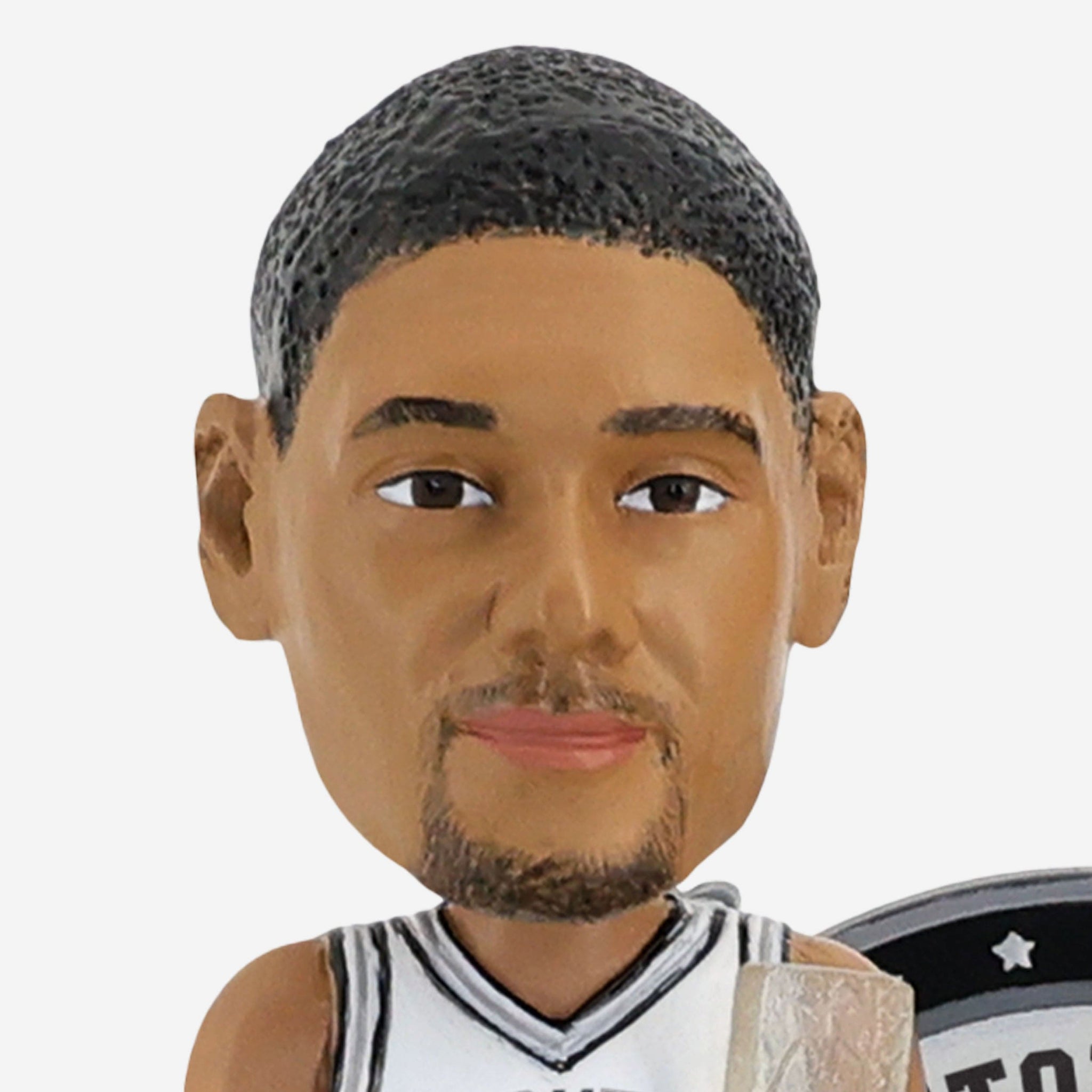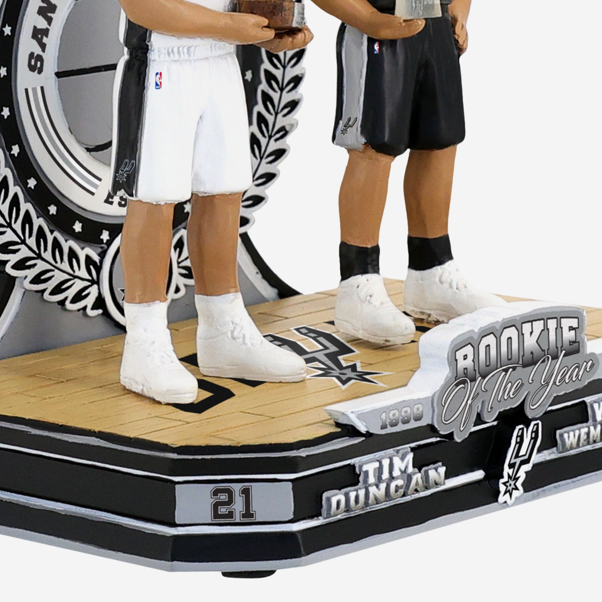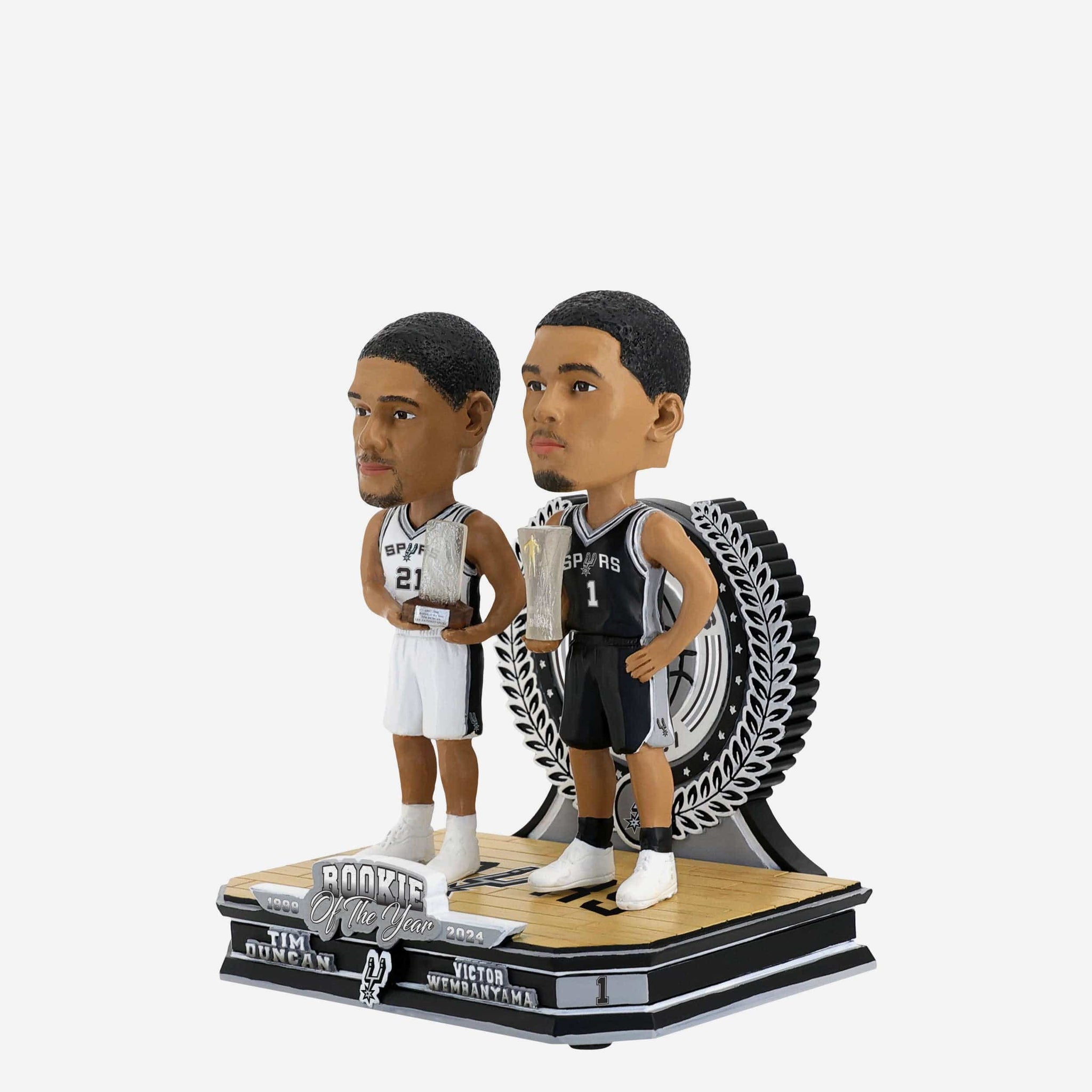 - Portrays Duncan wearing his white gameday uniform and Wembanyama wearing his black gameday uniform and holding their Rookie of the Year awards for a double dose of Spurs greatness