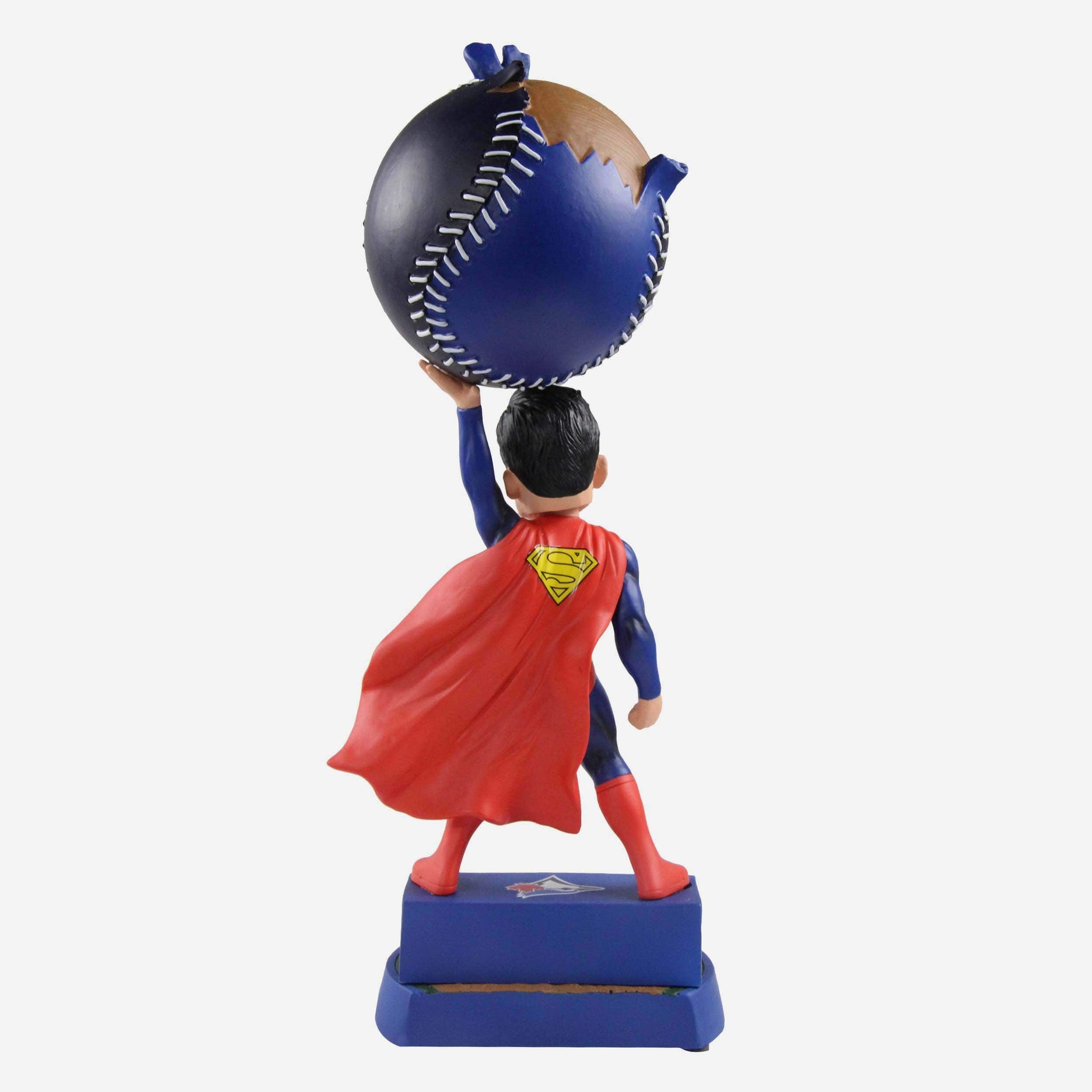- Portrays Superman posing and holding a team-colored baseball with team logo display, showing off that super strength