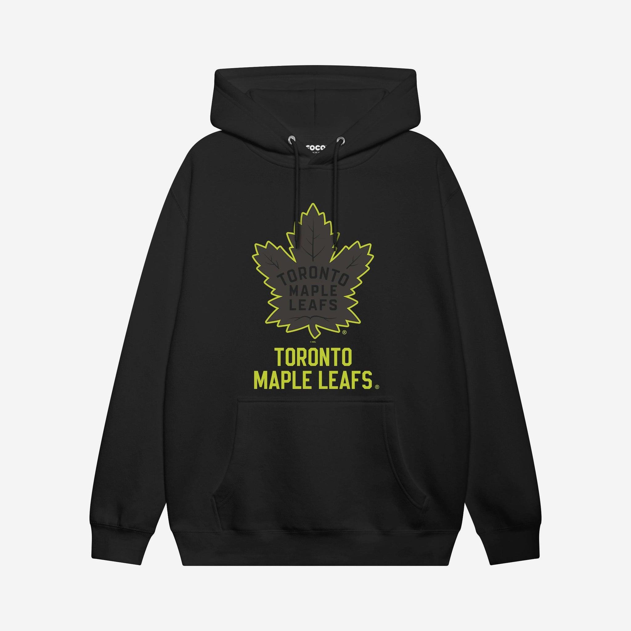 - Team logo display with highlight outline: The front of this apparel features a black Toronto Maple Leafs team logo display outlined in neon, and a neon team name display