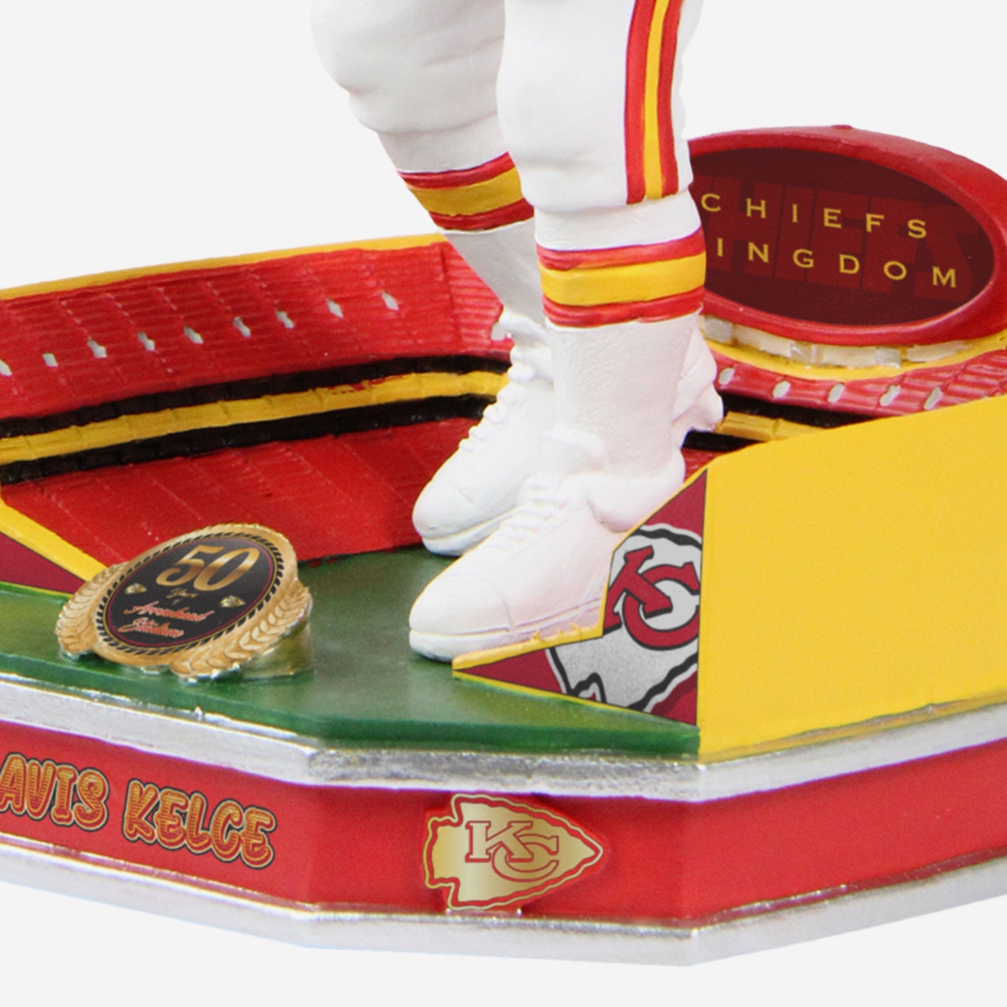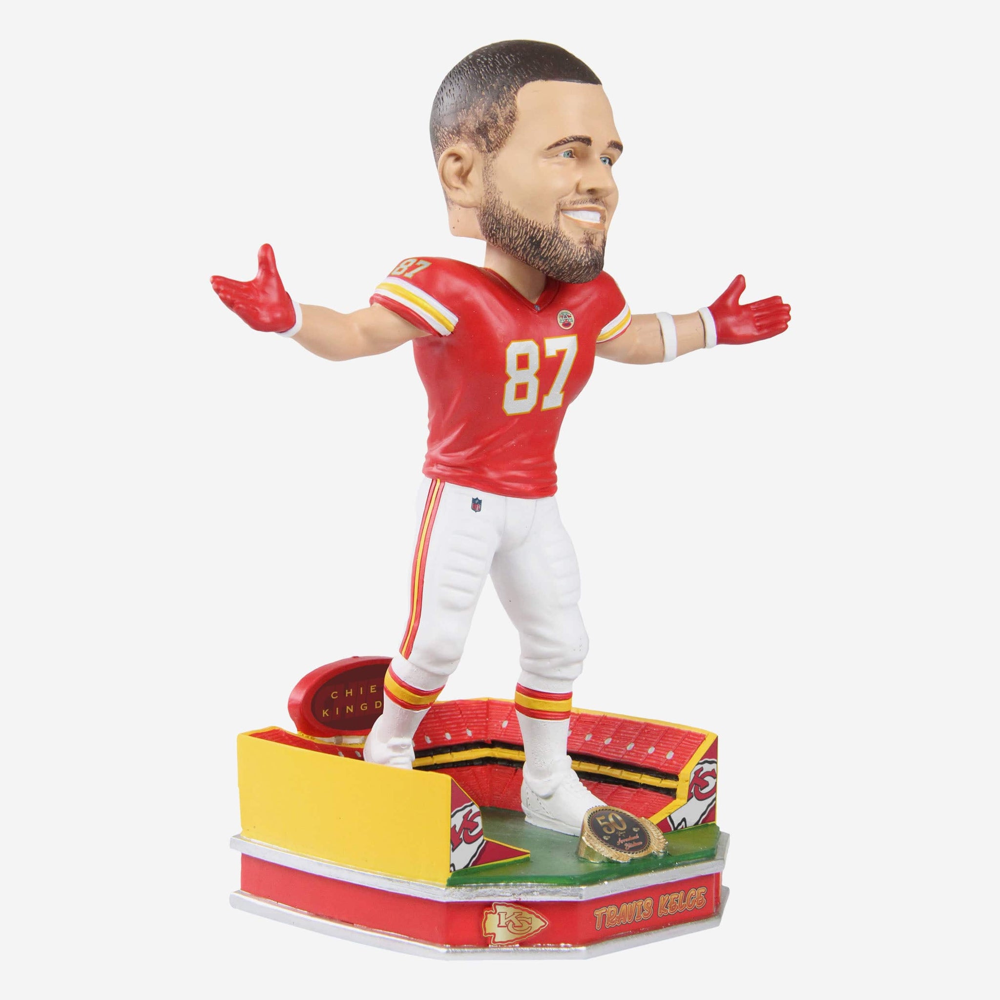 The Arrowhead crowd LOVES Travis and touchdowns. Thankfully, both of those things got the invite to the golden anniversary party with this Travis Kelce Kansas City Chiefs Arrowhead Stadium 50th Anniversary Bobblehead.