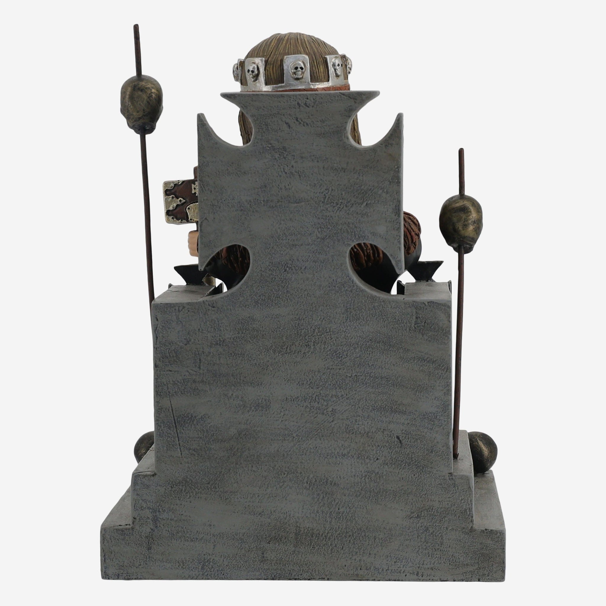 - Metal-textured throne backdrop with skull accent displays on armrests of throne because this guy is the King of Kings