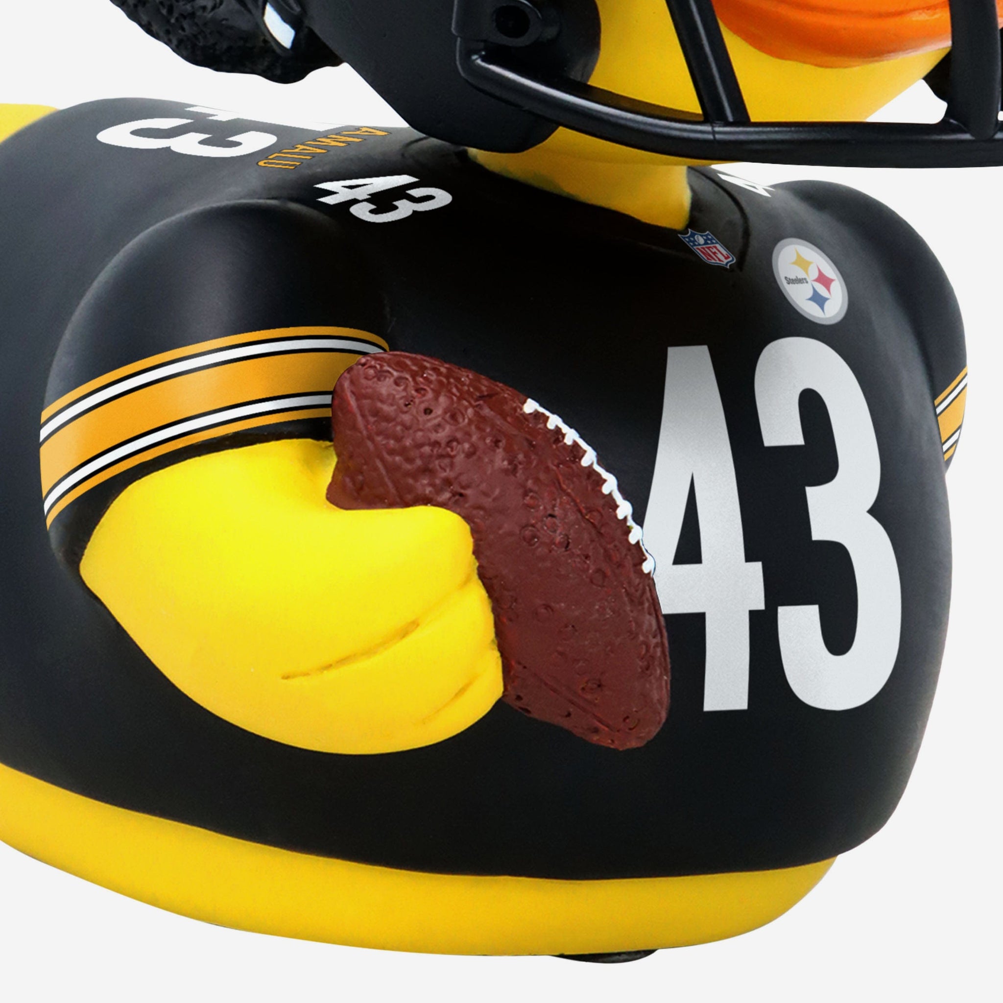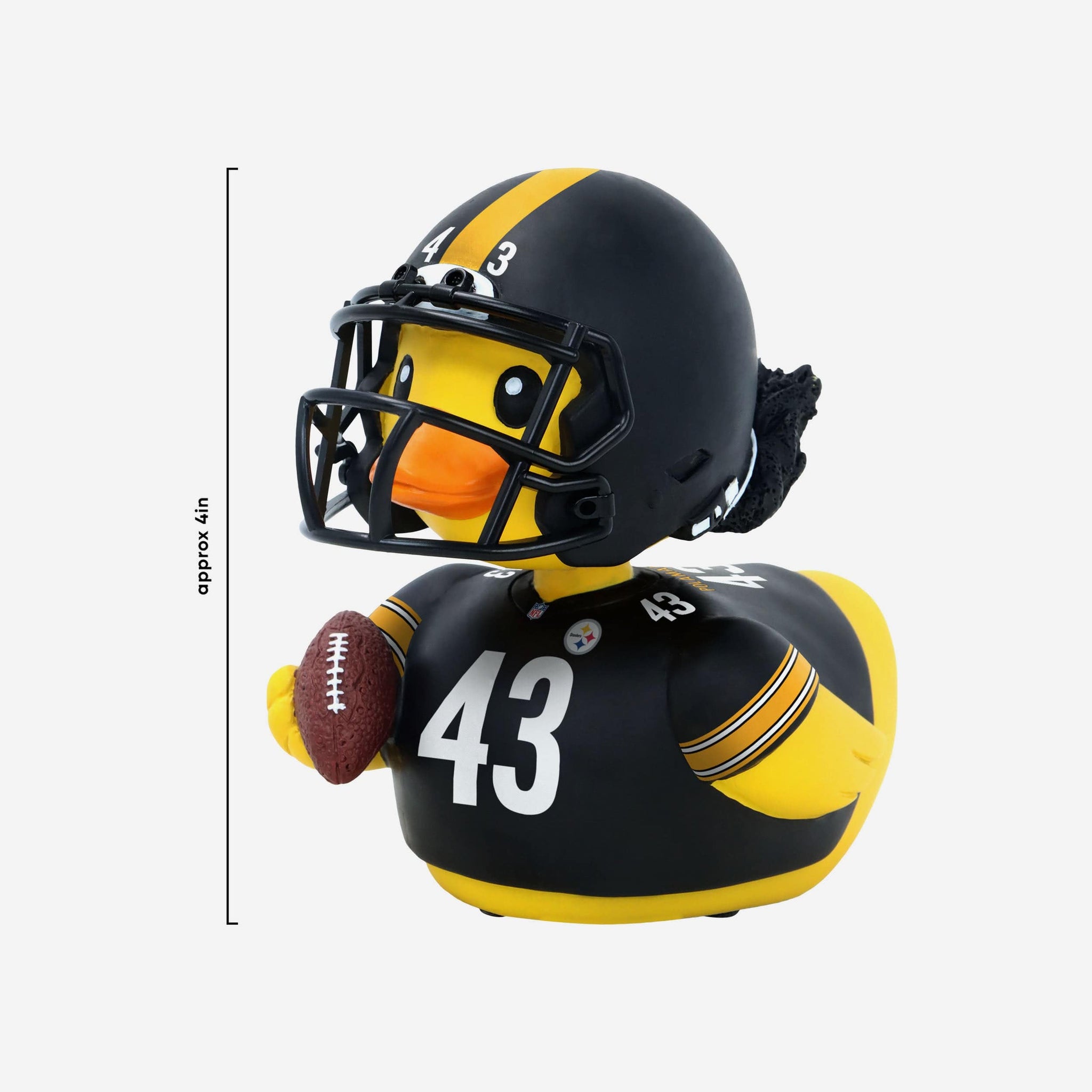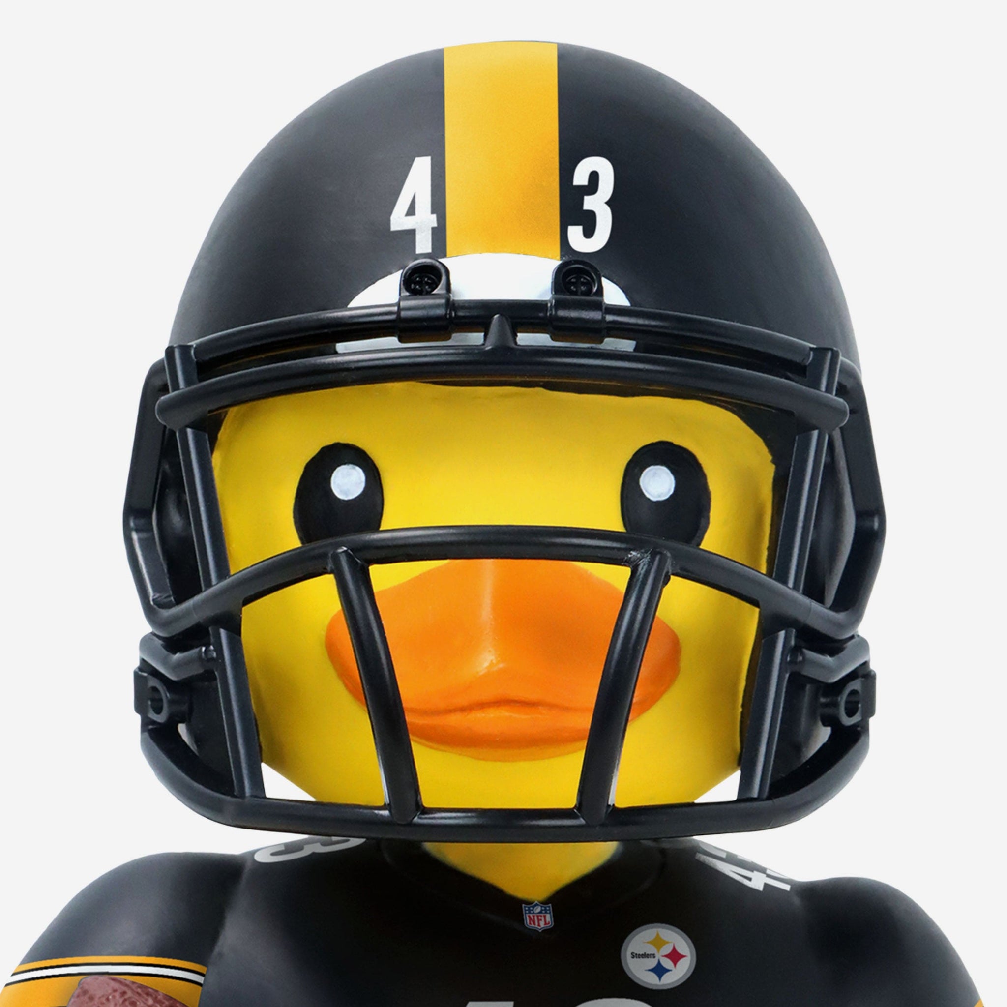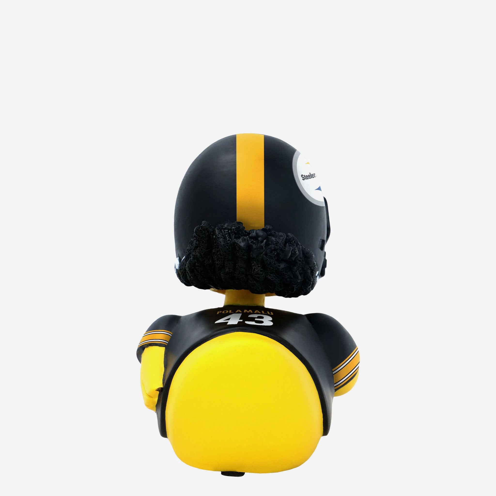 - Portrays duck wearing Troy Polamalu's black gameday uniform and team helmet, ready to make a splash in your collection