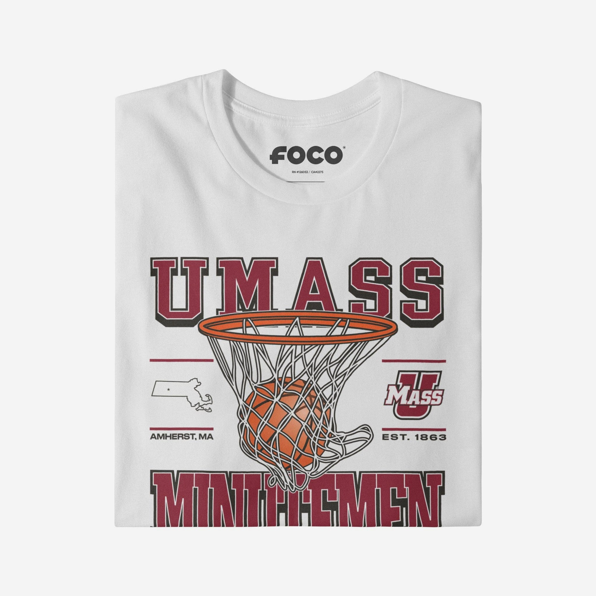 This top features a design that showcases your all-important team colors, a team logo display, a team wordmark name display, year of team establishment, and a basketball swishing through a net display meaning this t-shirt will prove your unmatched dedication to the UMass Minutemen when you're at the game or watching at home. In other words, this graphic tee is about to be your new favorite teammate.