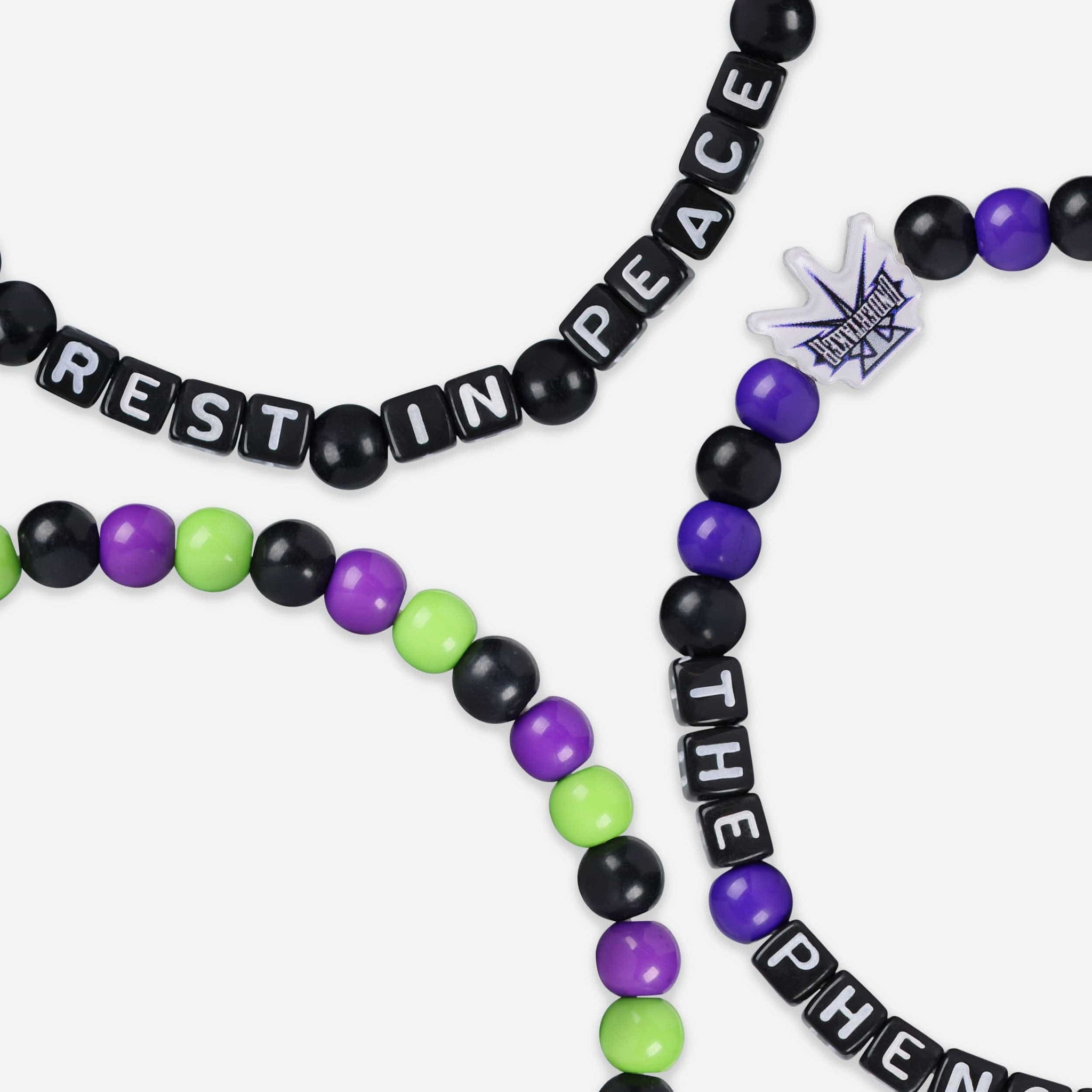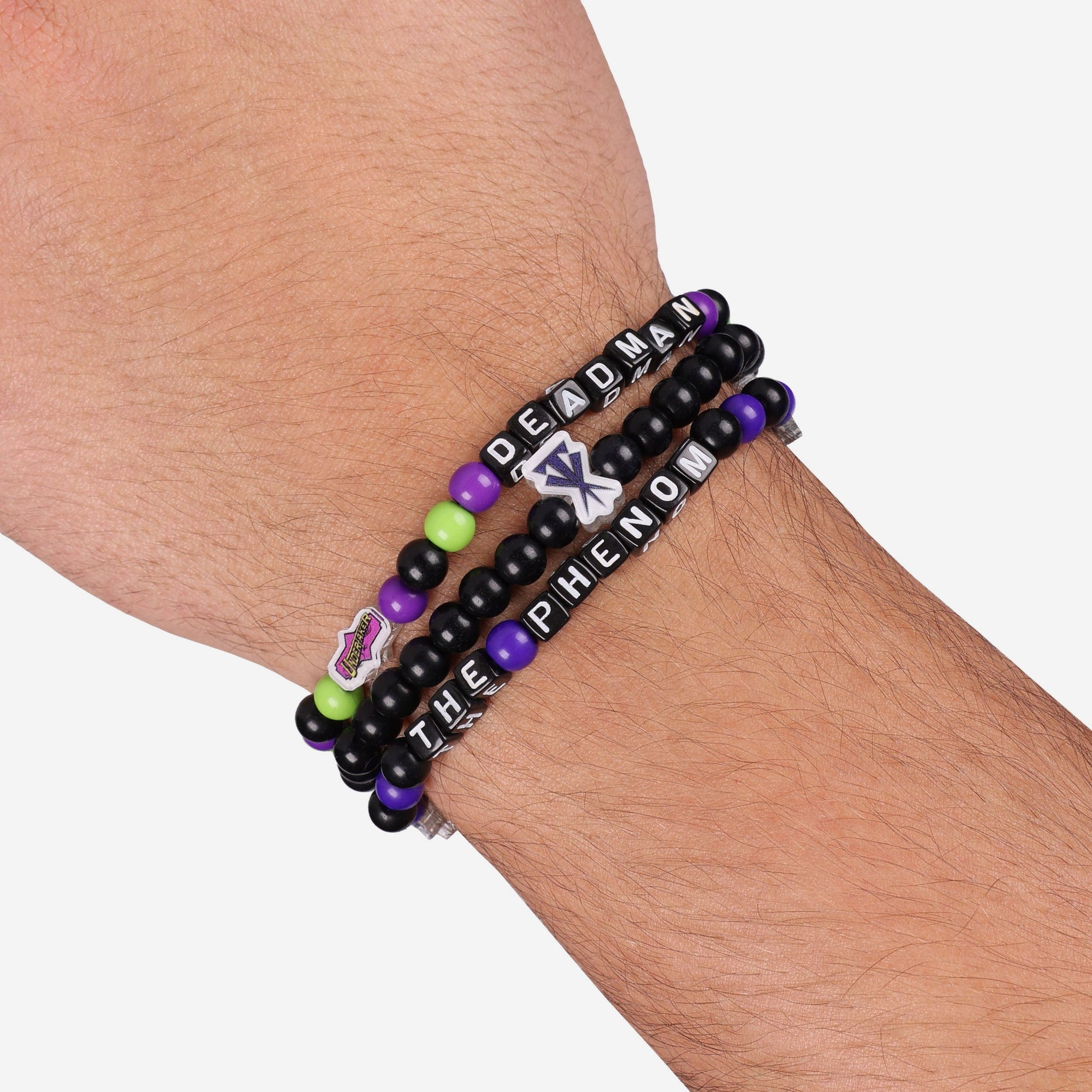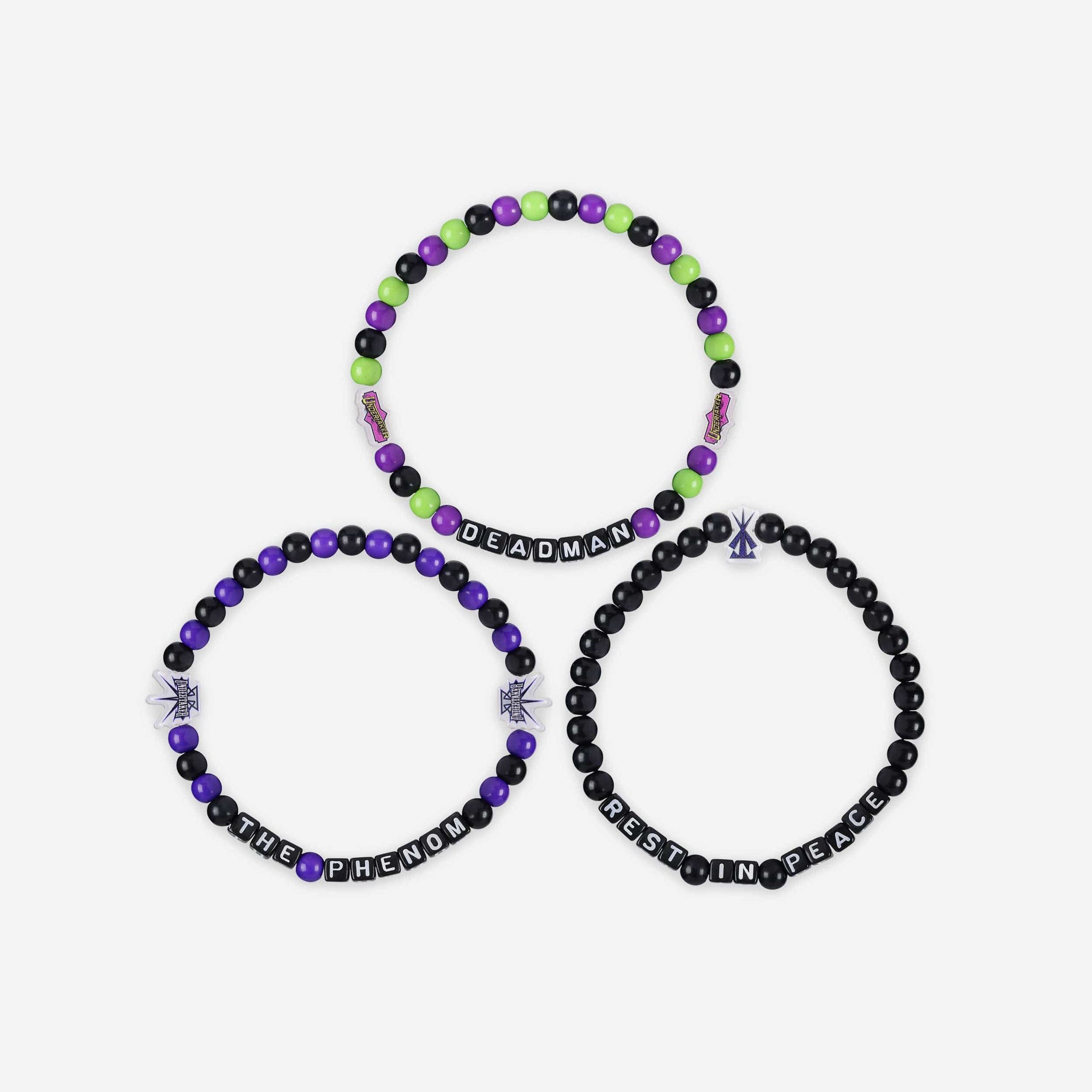 A whole new way to rep your favorite superstar in style is here. Step up your fan fashion sense with this Undertaker WWE 3 Pack Beaded Friendship Bracelet. These matching friendship bracelets have an all-over team-colored design and team logo displays, which makes them the perfect way to show your support for The Phenom from the opening bell to pinfall, and every day in between.