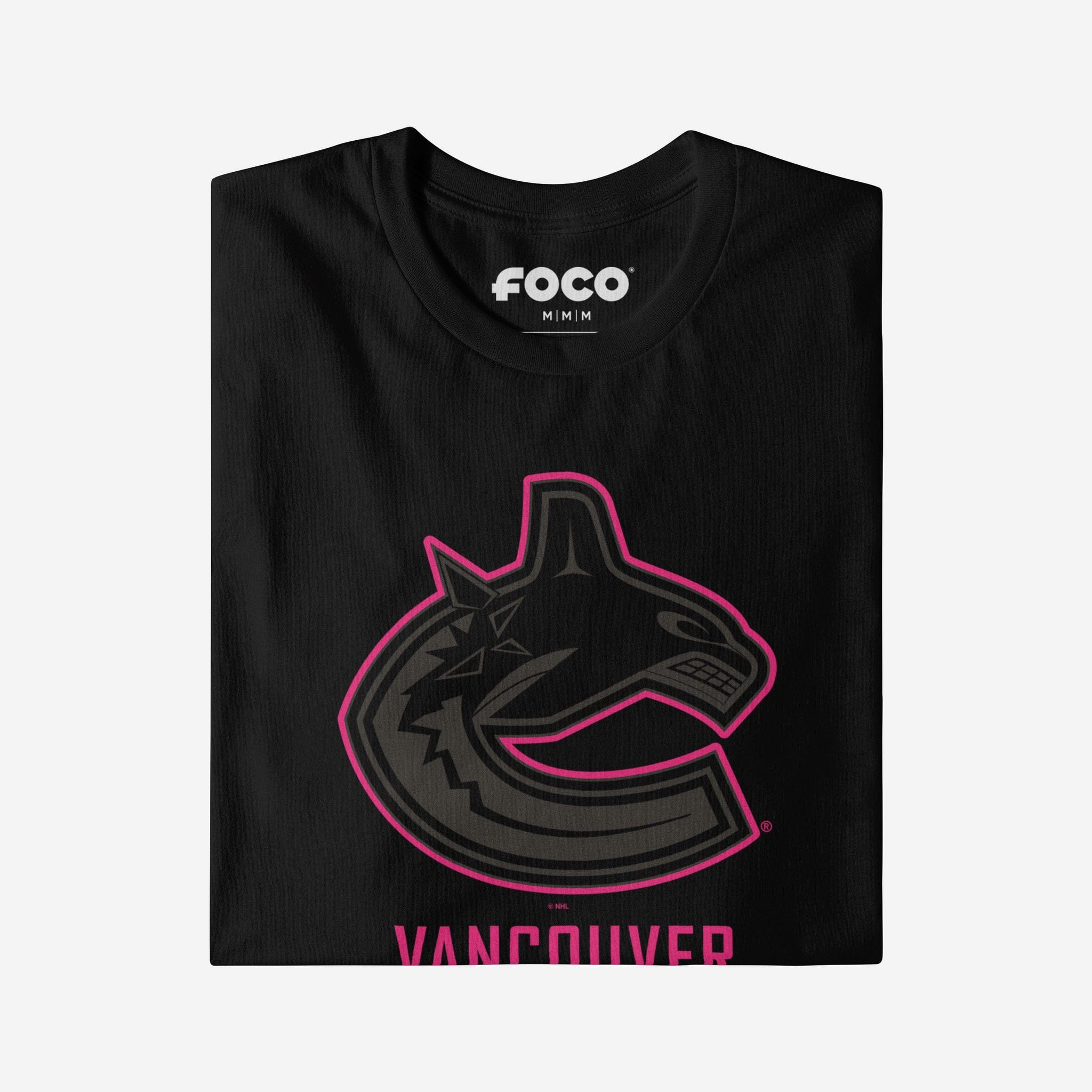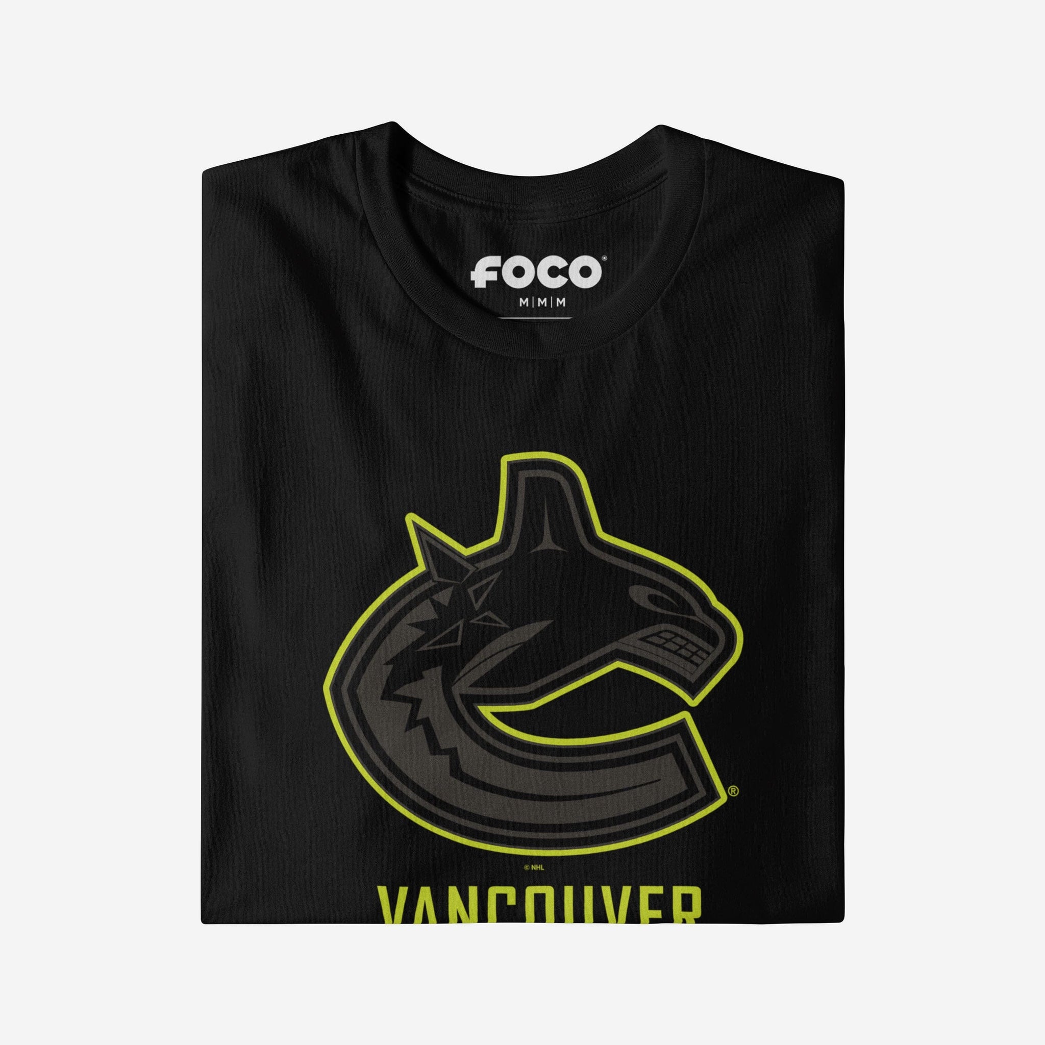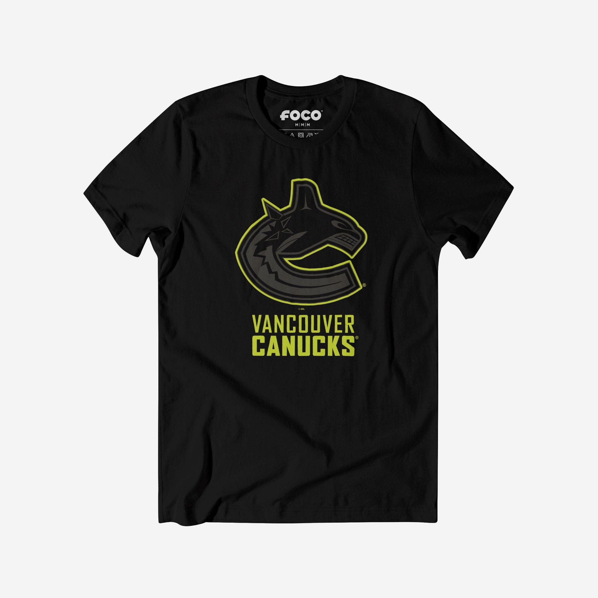 - Team logo display with highlight outline: The front of this apparel features a black Vancouver Canucks team logo display outlined in neon, and a neon wordmark team name display