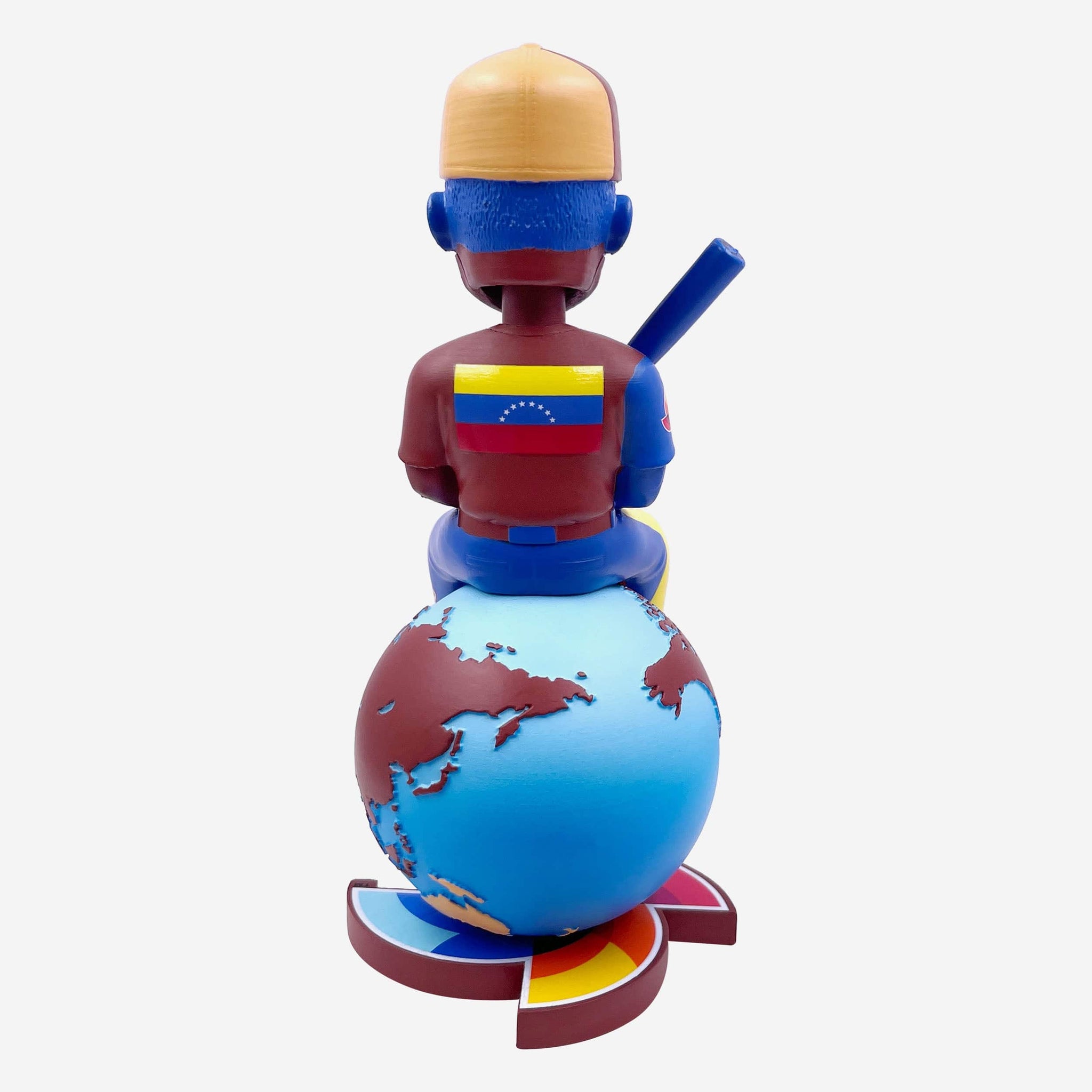 • Portrays figure wearing a gameday uniform, holding a bat, and sitting on a globe, because he's on top of the world