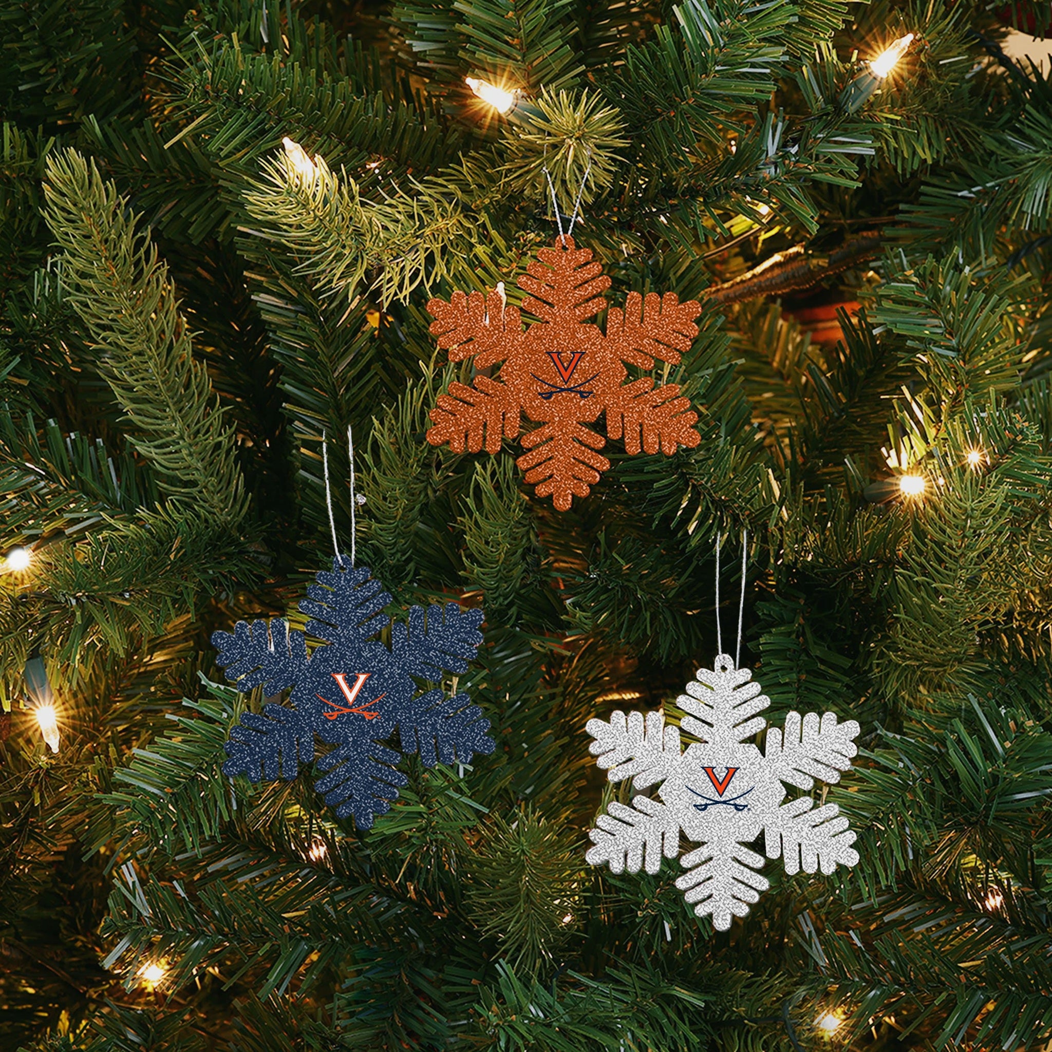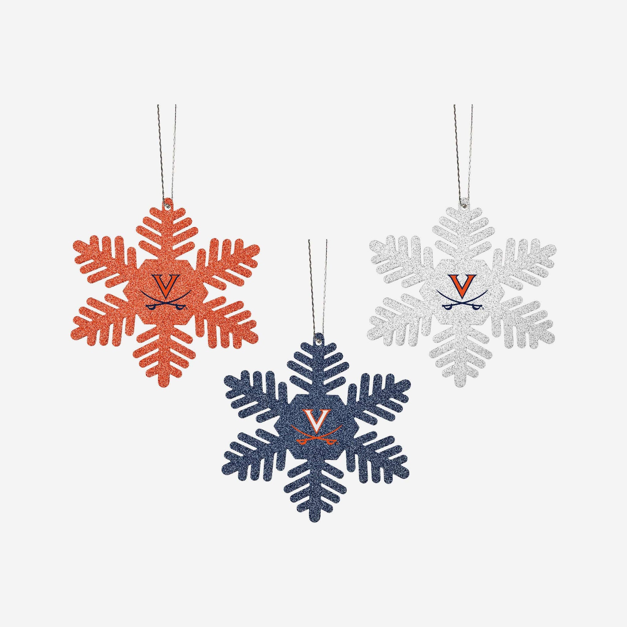 One half "Let it Snow", one half "Go Team Go!" This holiday season, let your team spirit AND holiday spirit shine by proudly displaying this Virginia Cavaliers 3 Pack Metal Glitter Snowflake Ornament!