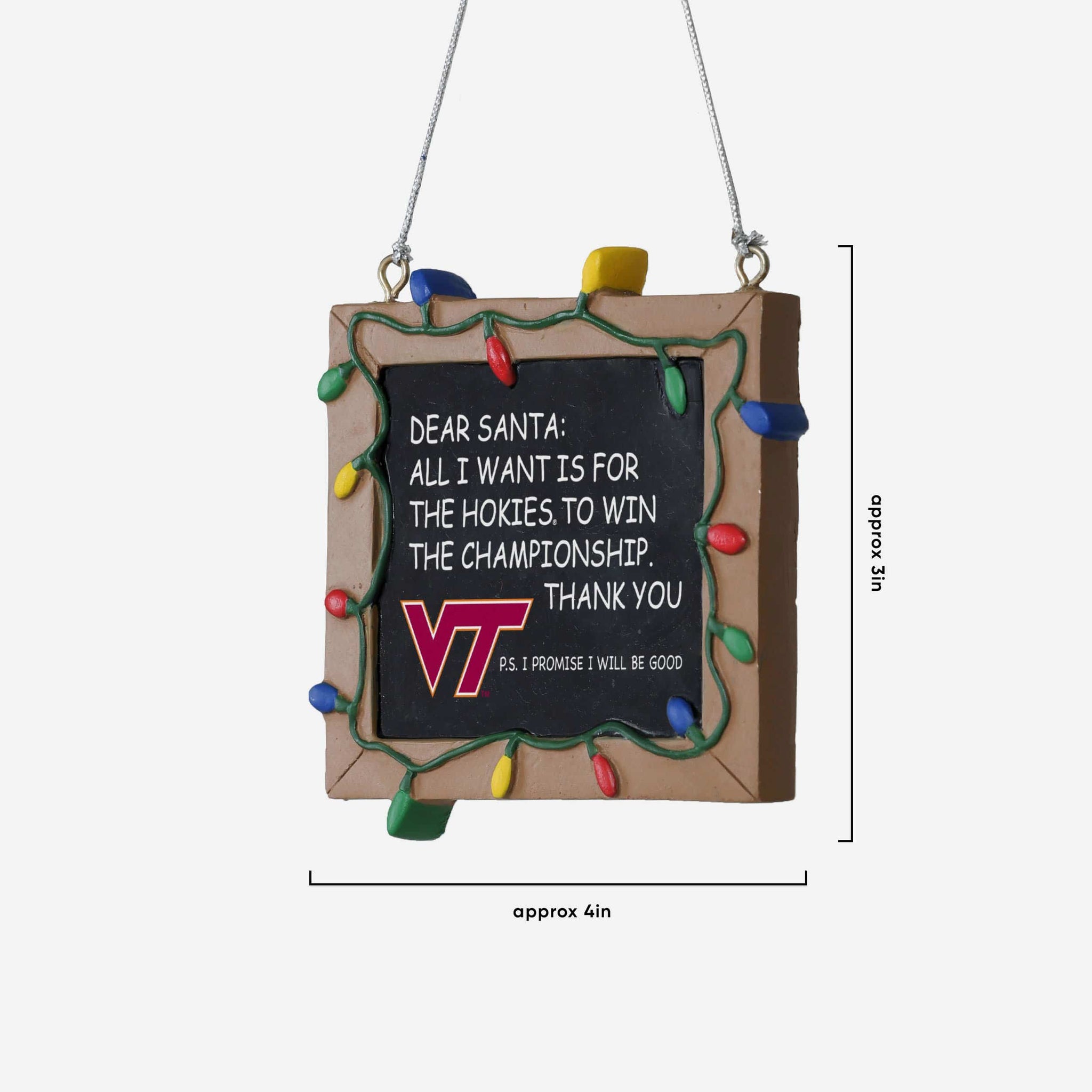 So, you made your list and sent it to jolly ol' Fanta Claus, asking him for a championship. But sometimes letters can get lost in the mail. Just in case, put this Virginia Tech Hokies Chalkboard Sign Ornament on your tree to let him know how good you've been this year, and that all you want for the holidays is a trophy.
