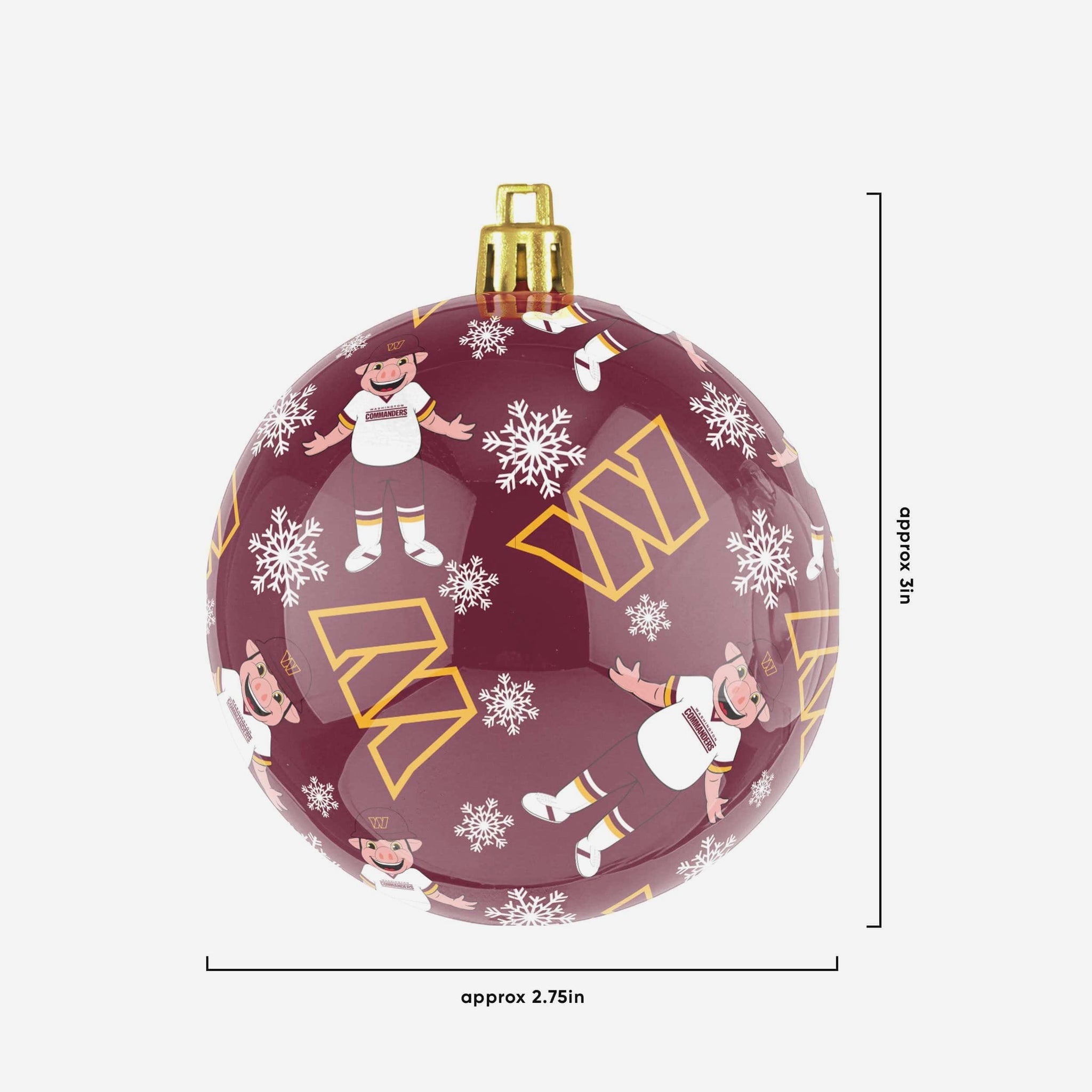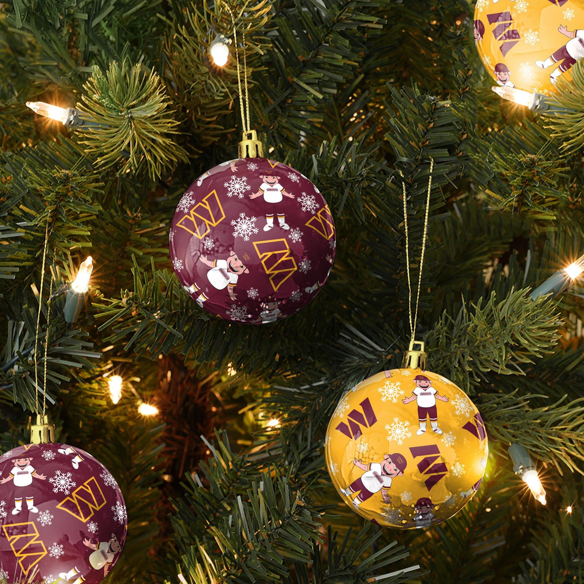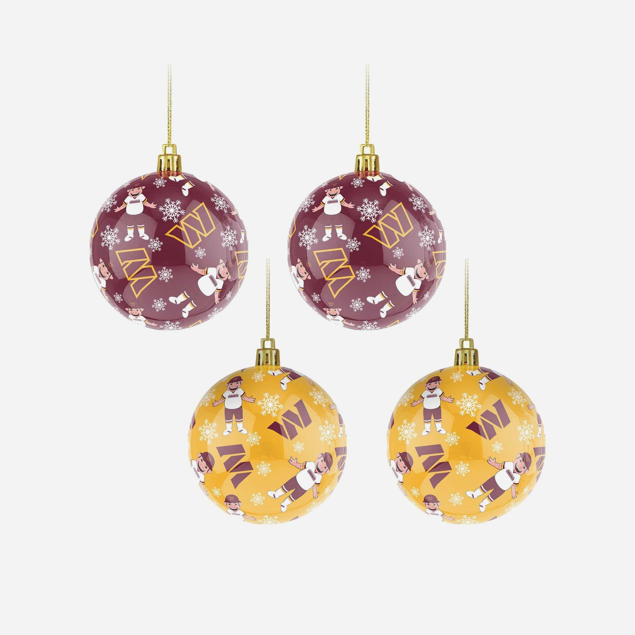 Bring the spirit of the season and your team together with the Washington Commanders 4 Pack Ball Mascot Ornament Set. This festive set includes four lightweight, plastic ornaments in two bold team-colored designs, each featuring repeat mascot and logo graphics.
