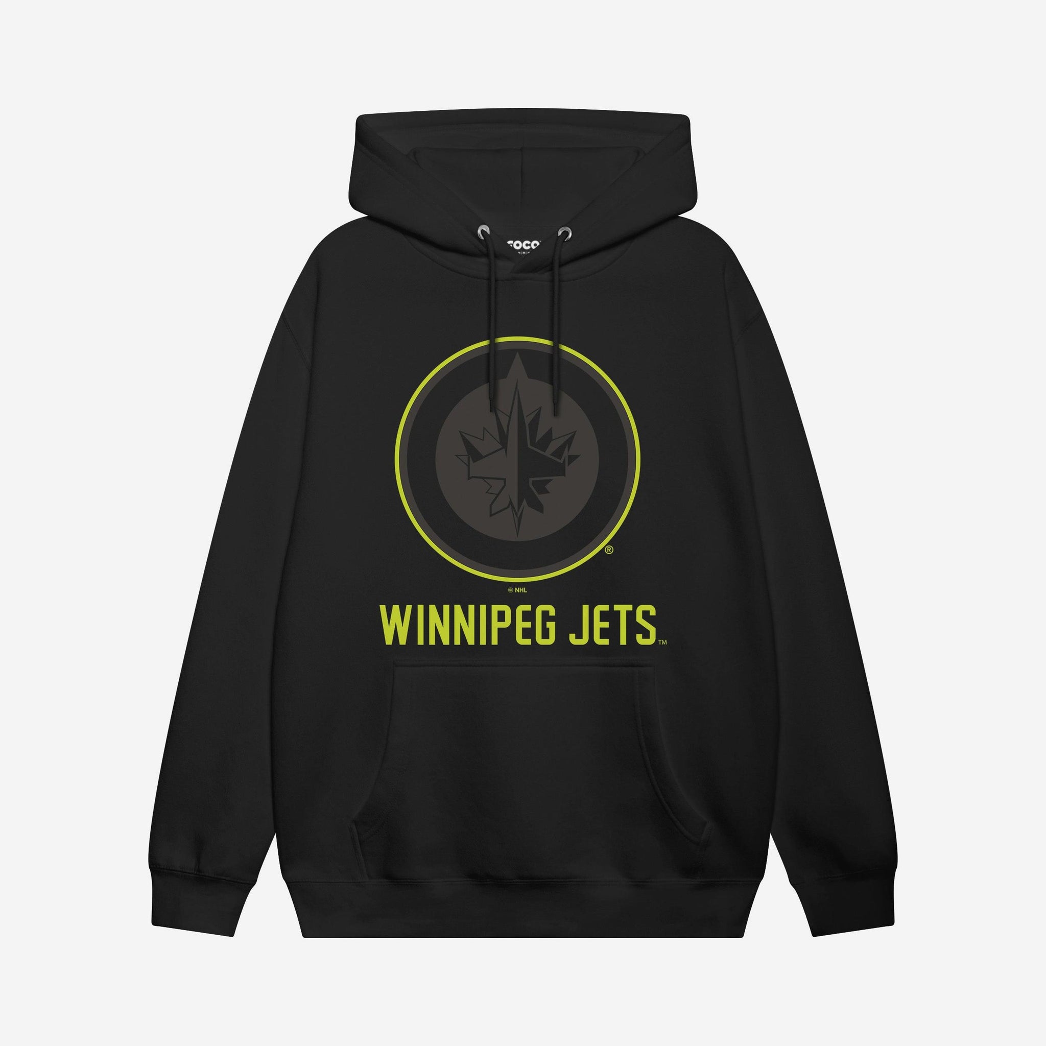 - Team logo display with highlight outline: The front of this apparel features a black Winnipeg Jets team logo display outlined in neon, and a neon team name display