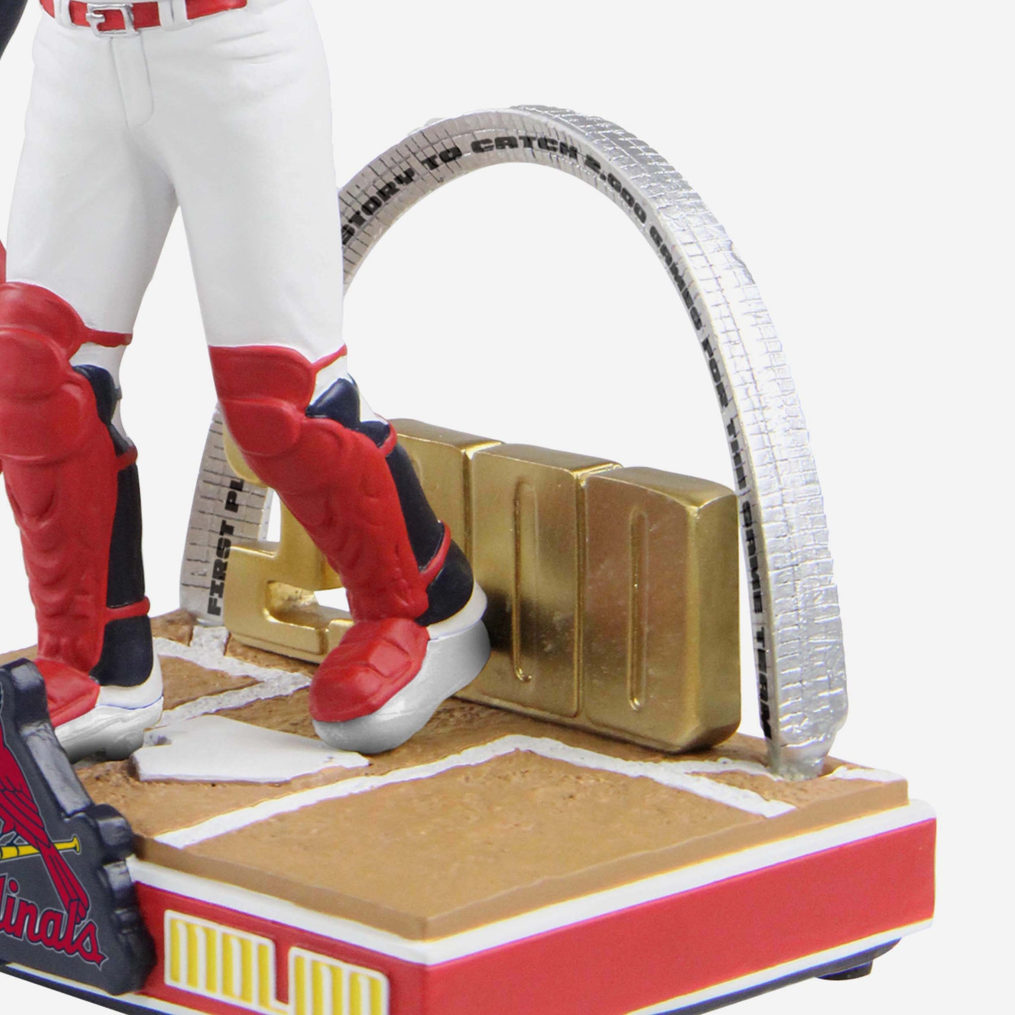 - Gold-colored 2,000 and Gateway Arch backdrop with text commemorating Molina’s achievement