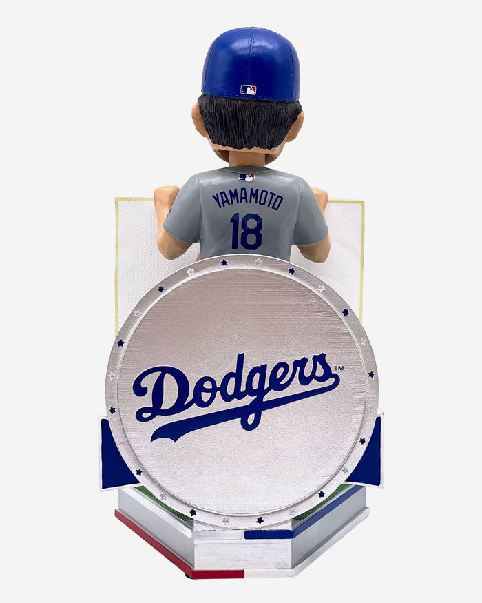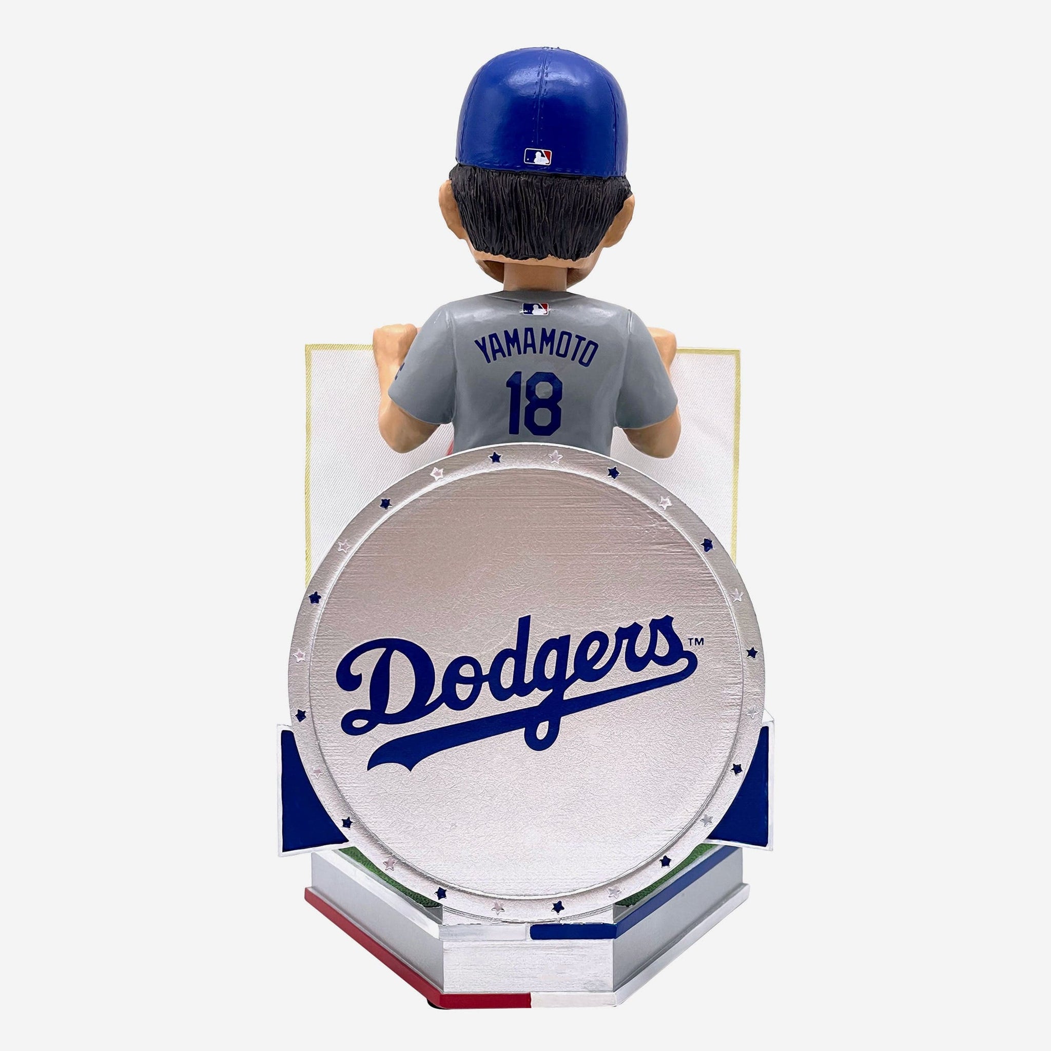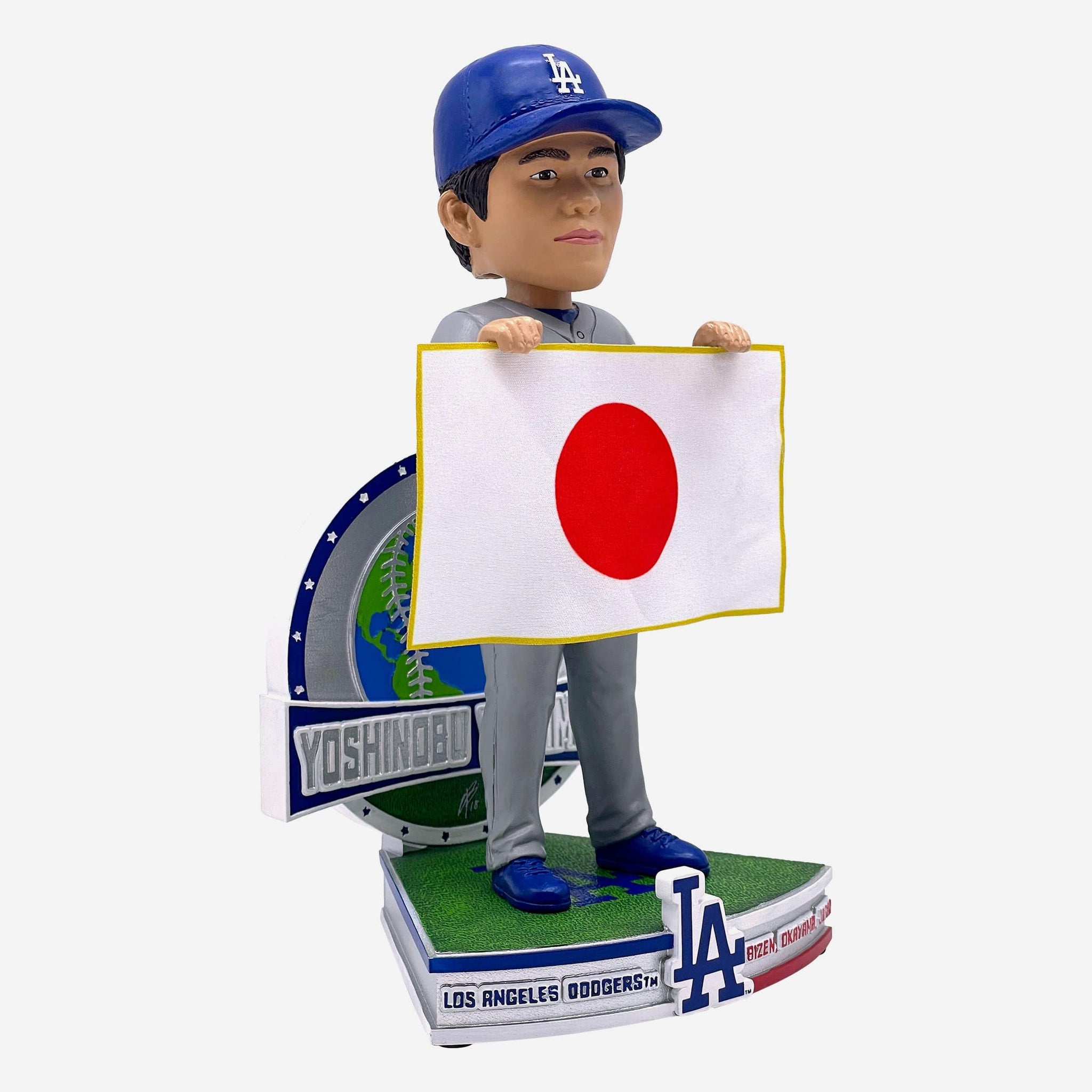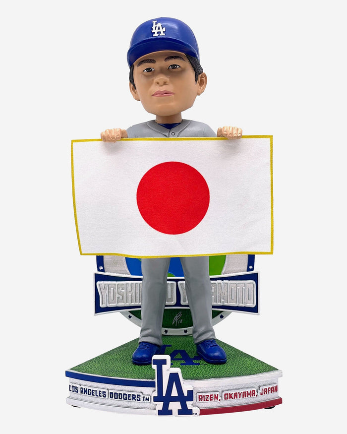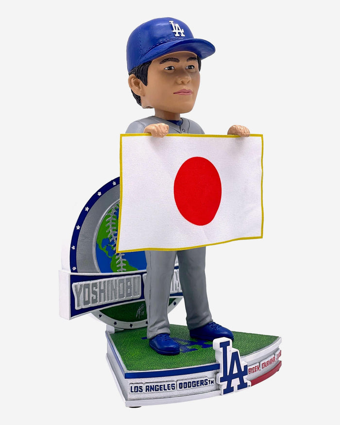 Just call this guy Mr. Worldwide! Your collection is going to be ready to go global with the officially licensed Yoshinobu Yamamoto Los Angeles Dodgers Away Jersey Japanese National Flag Bobblehead.